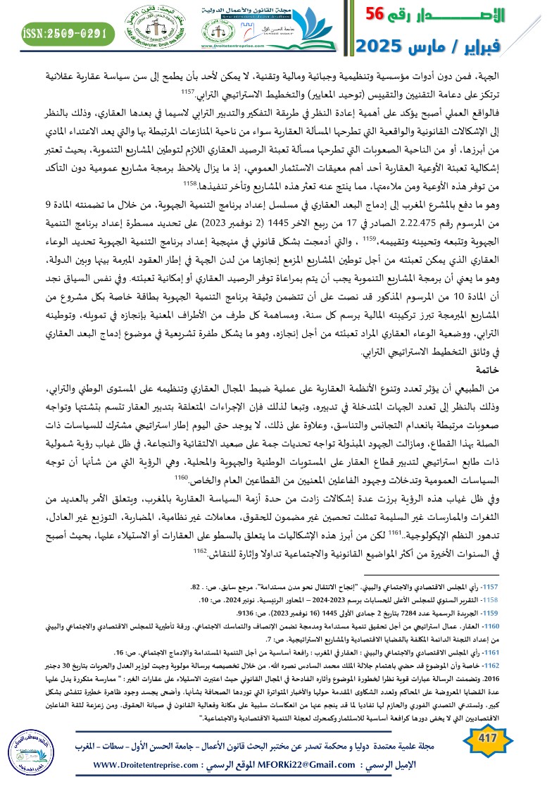يحتاج تنزيل البرامج الحكومية والسياسات القطاعية على المستوى الوطني وكذا تنزيل التصاميم الجهوية لإعداد التراب وبرامج التنمية الجهوية على المستوى الترابي إلى أرضية عقارية صلبة تضمن شروط نجاحها، وفي ظل غياب سياسة عقارية تعمل على تسخير العقار وتطويعه من الناحية التشريعية والمادية وحتى العلمية فلا مجال للحديث عن نجاح هذه السياسات والتدخلات العمومية، وعليه فإن الرهان يتمثل في إرساء سياسة عقارية موازية لهذه البرامج والتصاميم والمخططات، من أجل جعل العقار رافعة للتنمية الاقتصادية والاجتماعية والية لتحقيق العدالة العقارية والانصاف الترابي.