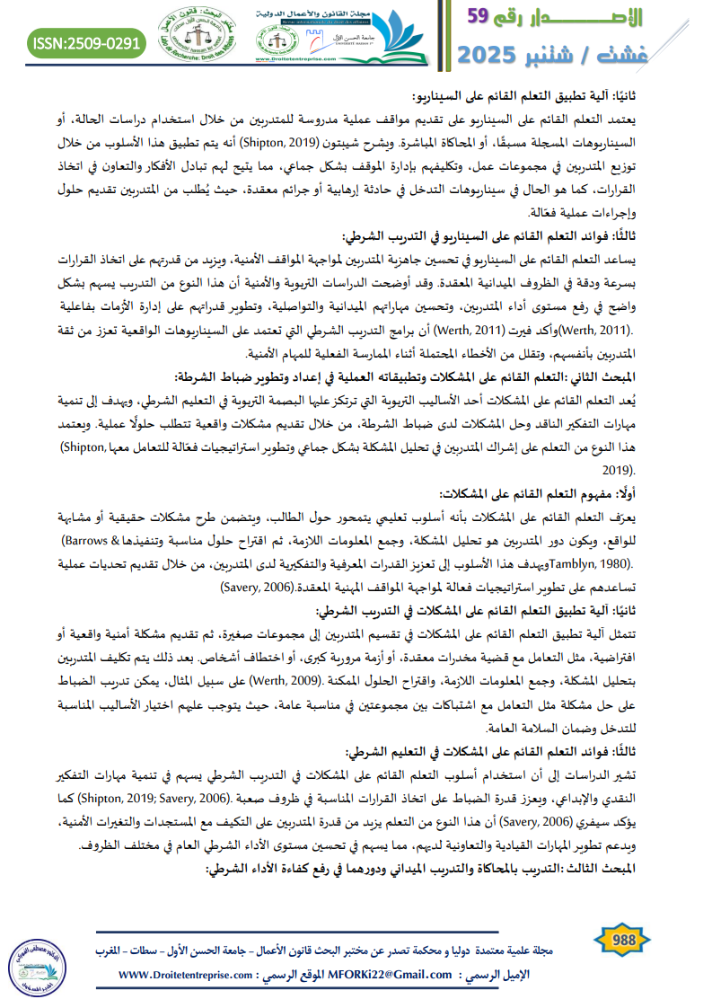 تشير الدراسات إلى أن استخدام أسلوب التعلم القائم على المشكلات في التدريب الشرطي يسهم في تنمية مهارات التفكير النقدي والإبداعي، ويعزز قدرة الضباط على اتخاذ القرارات المناسبة في ظروف صعبة (Shipton, 2019; Savery, 2006). كما يؤكد سيفري (Savery, 2006) أن هذا النوع من التعلم يزيد من قدرة المتدربين على التكيف مع المستجدات والتغيرات الأمنية، ويدعم تطوير المهارات القيادية والتعاونية لديهم، مما يسهم في تحسين مستوى الأداء الشرطي العام في مختلف الظروف.