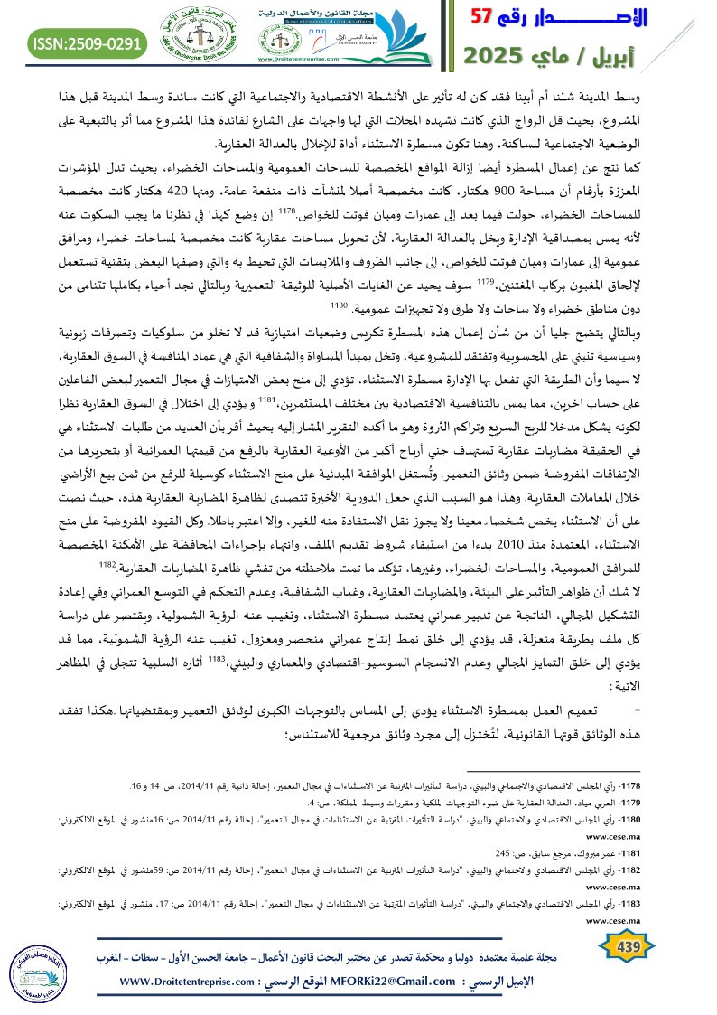 [46]– رأي المجلس الاقتصادي والاجتماعي والبيئي، “دراسة التأثيرات المترتبة عن الاستثناءات في مجال التعمير”، إحالة رقم 11/2014 ص: 59منشور في الموقع الالكتروني: www.cese.ma