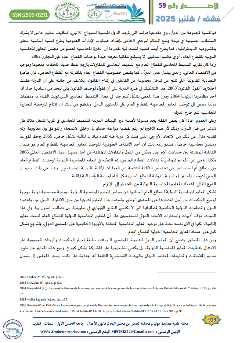 وقد تعزز البعد الدولي لحركة الإصلاحات الميزانيَّة والمحاسبية التي تمس اليوم أغلب الأنظمة المالية العمومية بشكل كبير بالنظر لأنها تمتح مصادرها النظرية على نطاق واسع من نموذج للحكامة المالية أذيع على الخصوص من طرف المنظمات الدولية من خلال المبادئ التي تعرض في “مدونات حسن السلوك” أو في توصياتها المتعلقة “بالممارسات الجيدة”… ولا يتضح البعد الدولي لحركة الإصلاحات في ميدان المالية العمومية من خلال مدونة مذهبية أو في ميدان المبادئ فقط، بل يظهر، أيضا، في مجال المعايير المحاسبية الدولية الخاصة بالقطاع العام[66].