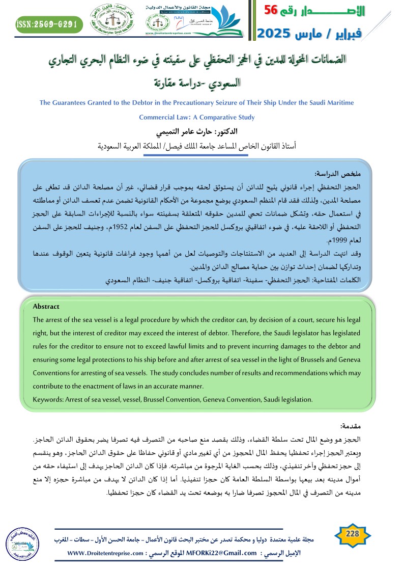 الضمانات المخولة للمدين في الحجز التحفظي على سفينته في ضوء النظام البحري التجاري السعودي -دراسة مقارنة الدكتور: حارث عامر التميمي