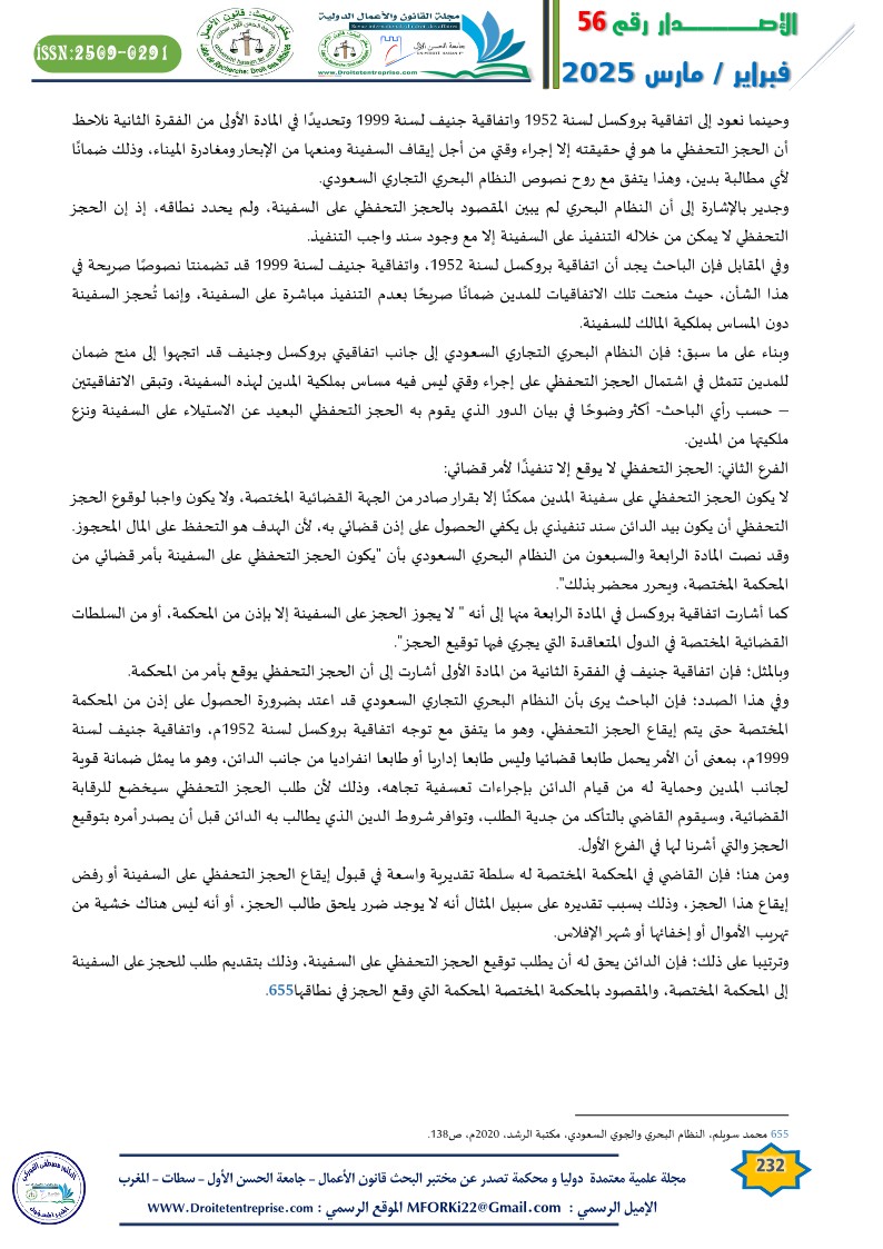 الكلمات المفتاحية: الحجز التحفظي- سفينة- اتفاقية بروكسل- اتفاقية جنيف- النظام السعودي