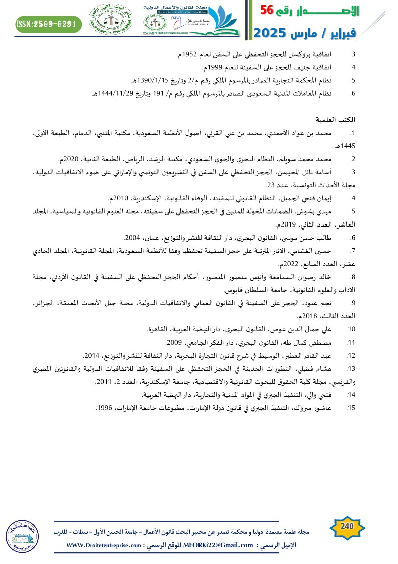 7. حسين الغشامي، الآثار المترتبة على حجز السفينة تحفظيا وفقا للأنظمة السعودية، المجلة القانونية، المجلد الحادي عشر، العدد السابع، 2022م.