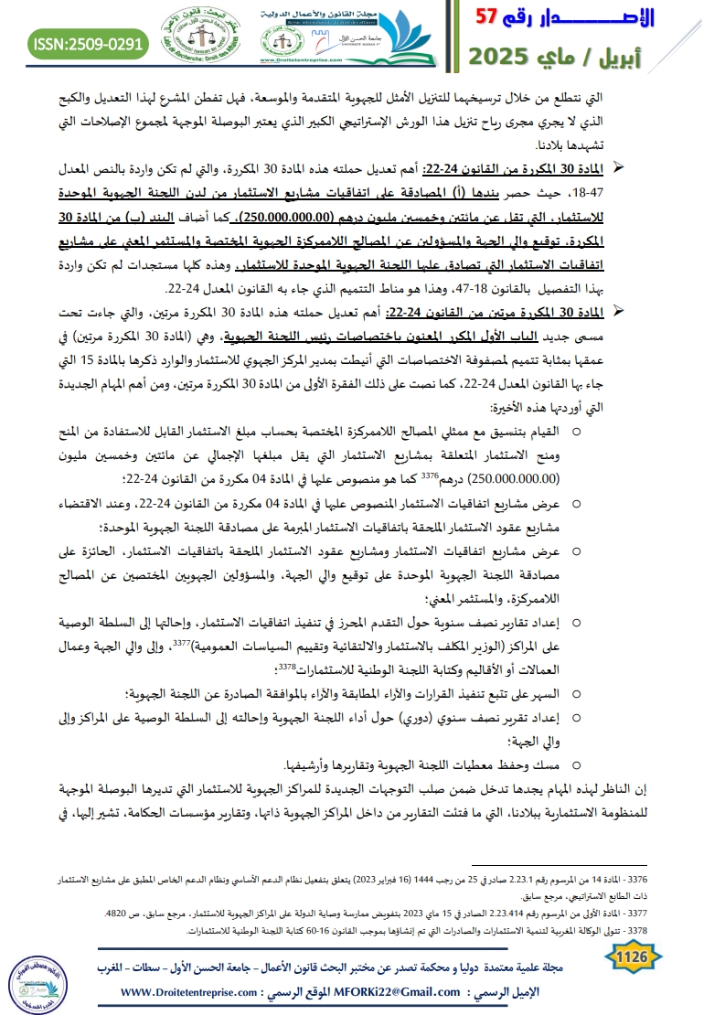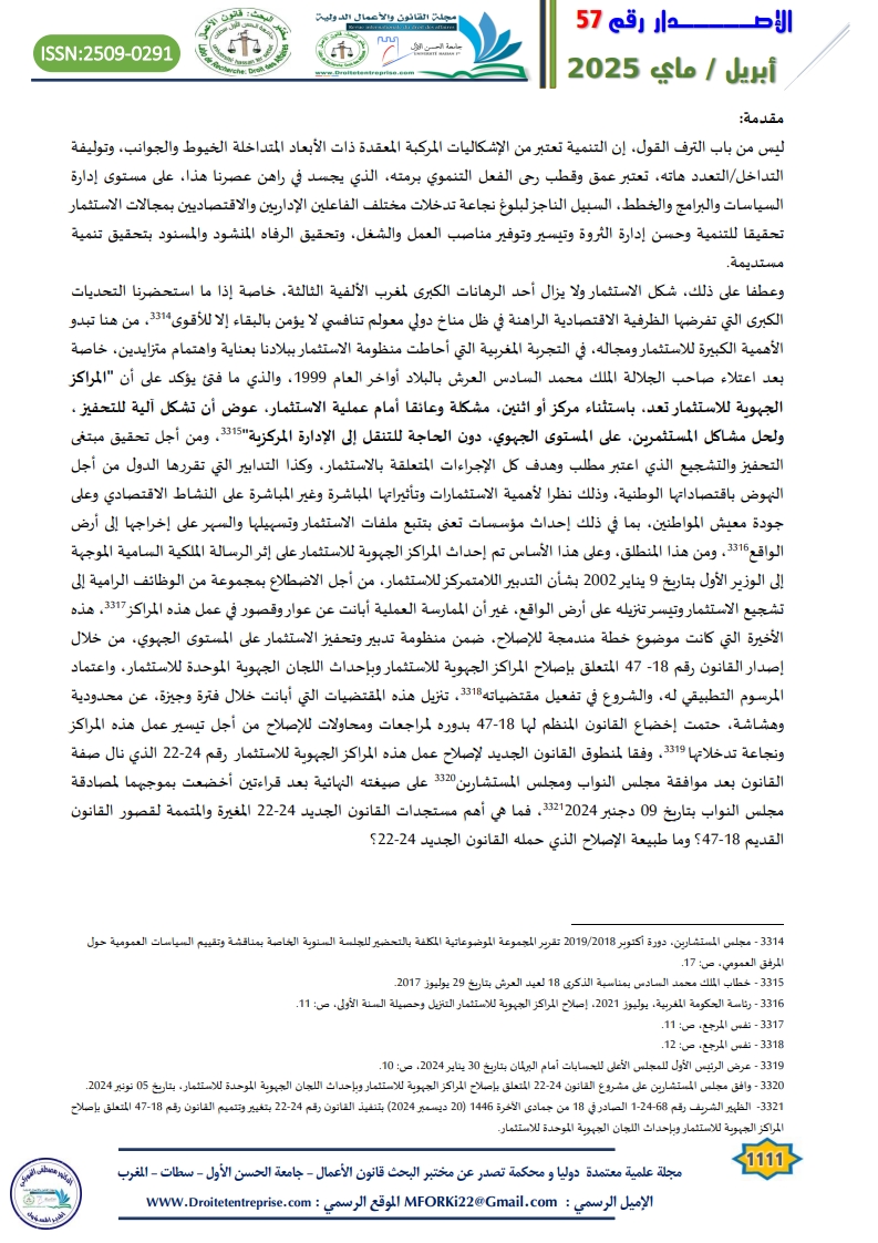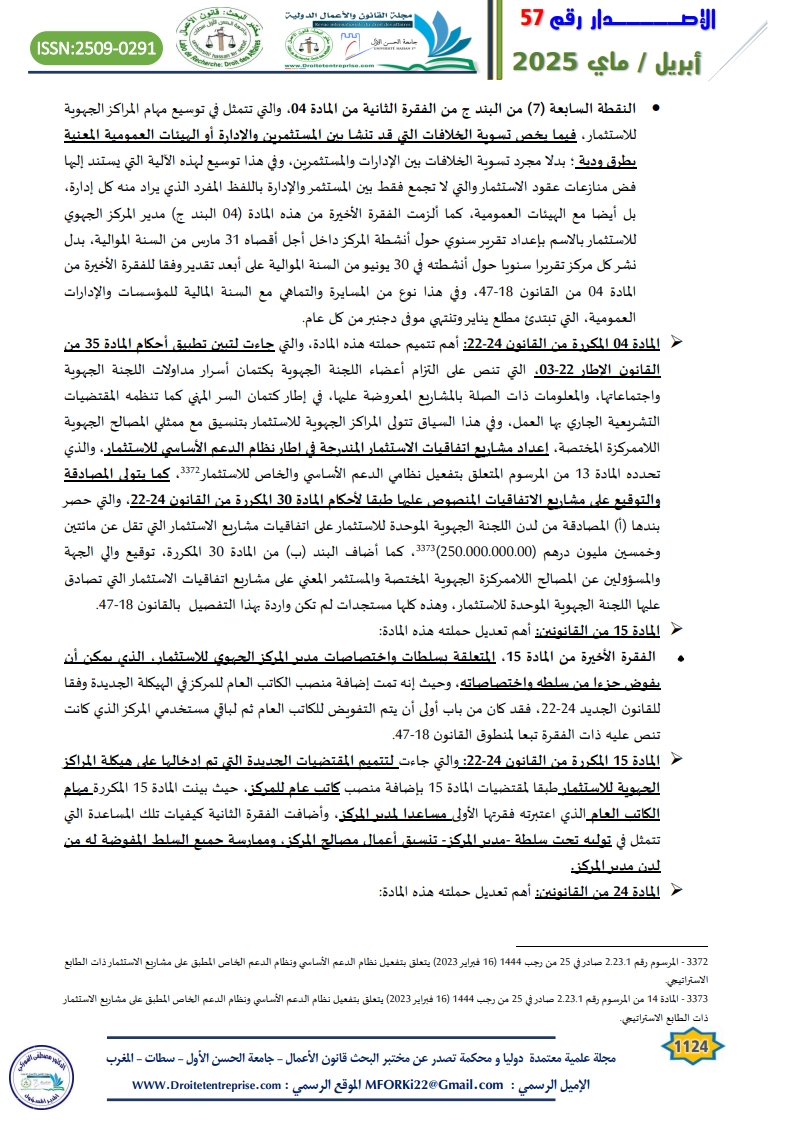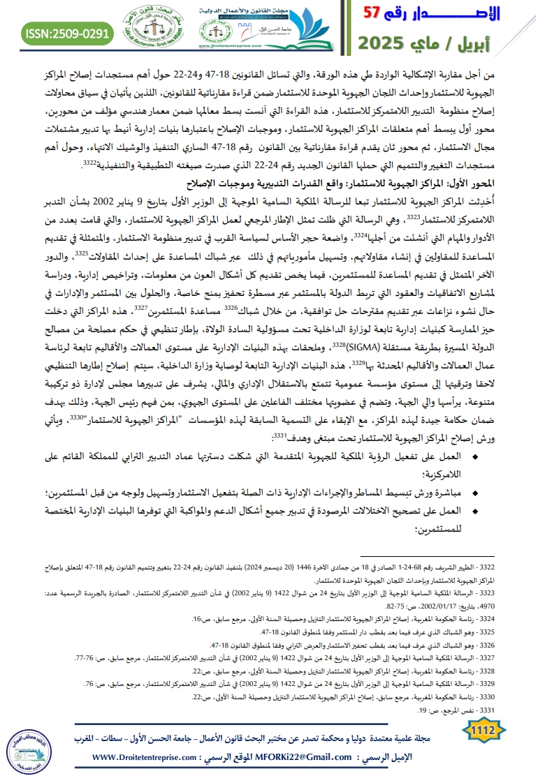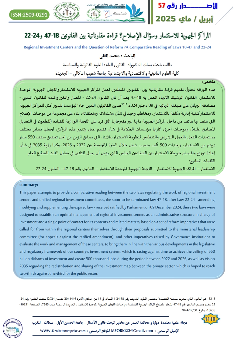 This paper attempts to provide a comparative reading between the two laws regulating the work of regional investment centers and unified regional investment committees, the soon-to-be-terminated law 47-18, after Law 22-24 – amending, modifying and supplementing the expired law – received ratified by Parliament on 09 December 2024, these two laws were designed to establish an optimal management of regional investment centers as an administrative structure in charge of investment and a single point of contact for its contents and related matters, based on a set of reform imperatives that were called for from within the regional centers themselves through their proposals submitted to the ministerial leadership committee (for appeals against the ratified amendment), and other imperatives raised by Governance institutions to evaluate the work and management of these centers, to bring them in line with the various developments in the legislative and regulatory framework of our country’s investment system, which is racing against time to achieve the ceiling of 550 billion dirhams of investment and create 500 thousand jobs during the period between 2022 and 2026, as well as Vision 2035 regarding the redistribution and sharing of the investment map between the private sector, which is hoped to reach two-thirds against one-third for the public sector.