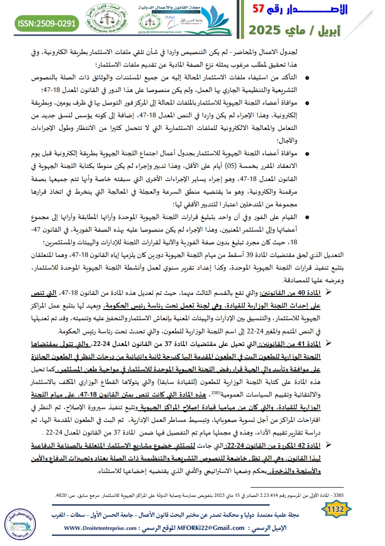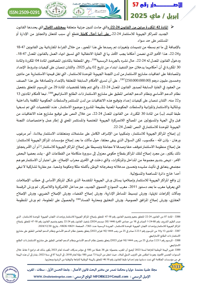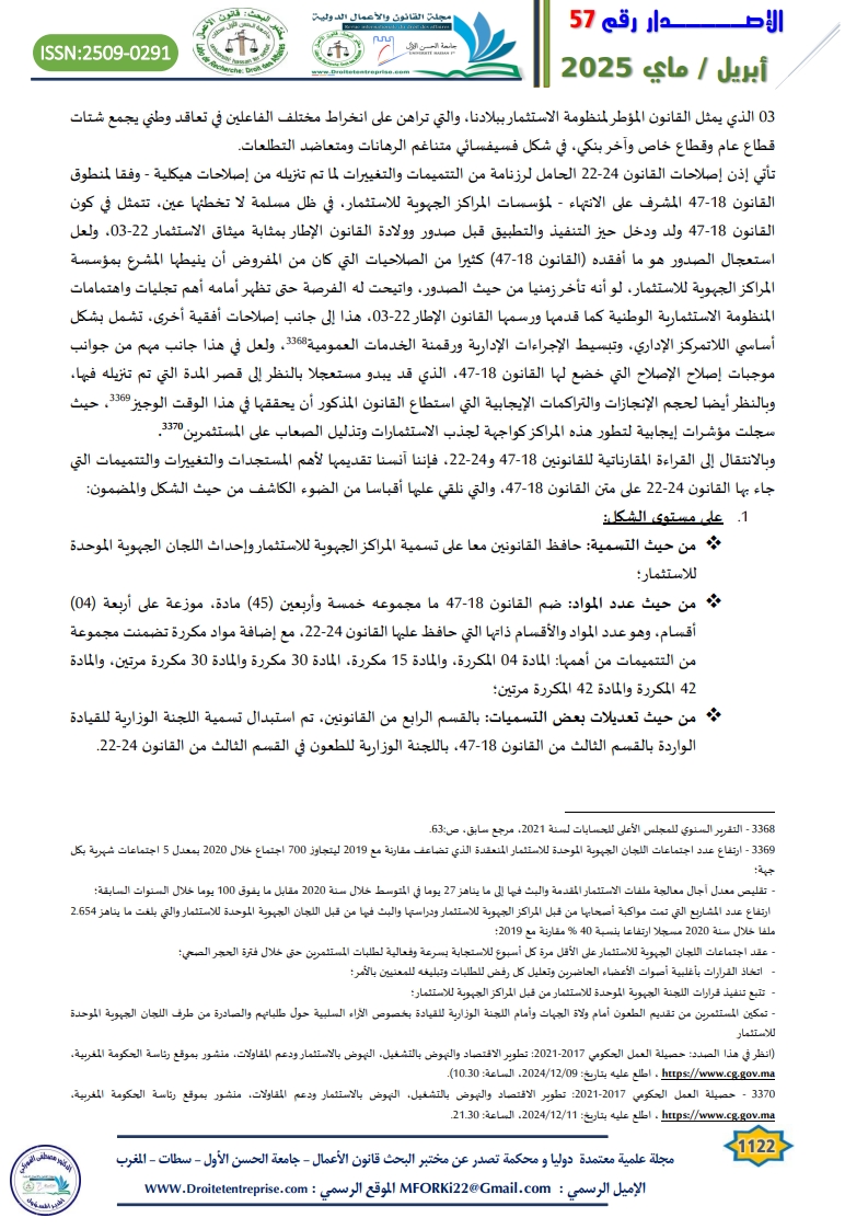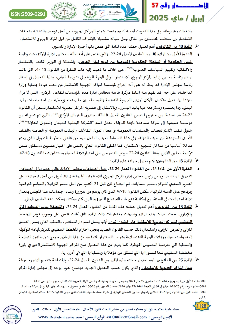 This paper attempts to provide a comparative reading between the two laws regulating the work of regional investment centers and unified regional investment committees, the soon-to-be-terminated law 47-18, after Law 22-24 – amending, modifying and supplementing the expired law – received ratified by Parliament on 09 December 2024, these two laws were designed to establish an optimal management of regional investment centers as an administrative structure in charge of investment and a single point of contact for its contents and related matters, based on a set of reform imperatives that were called for from within the regional centers themselves through their proposals submitted to the ministerial leadership committee (for appeals against the ratified amendment), and other imperatives raised by Governance institutions to evaluate the work and management of these centers, to bring them in line with the various developments in the legislative and regulatory framework of our country’s investment system, which is racing against time to achieve the ceiling of 550 billion dirhams of investment and create 500 thousand jobs during the period between 2022 and 2026, as well as Vision 2035 regarding the redistribution and sharing of the investment map between the private sector, which is hoped to reach two-thirds against one-third for the public sector.