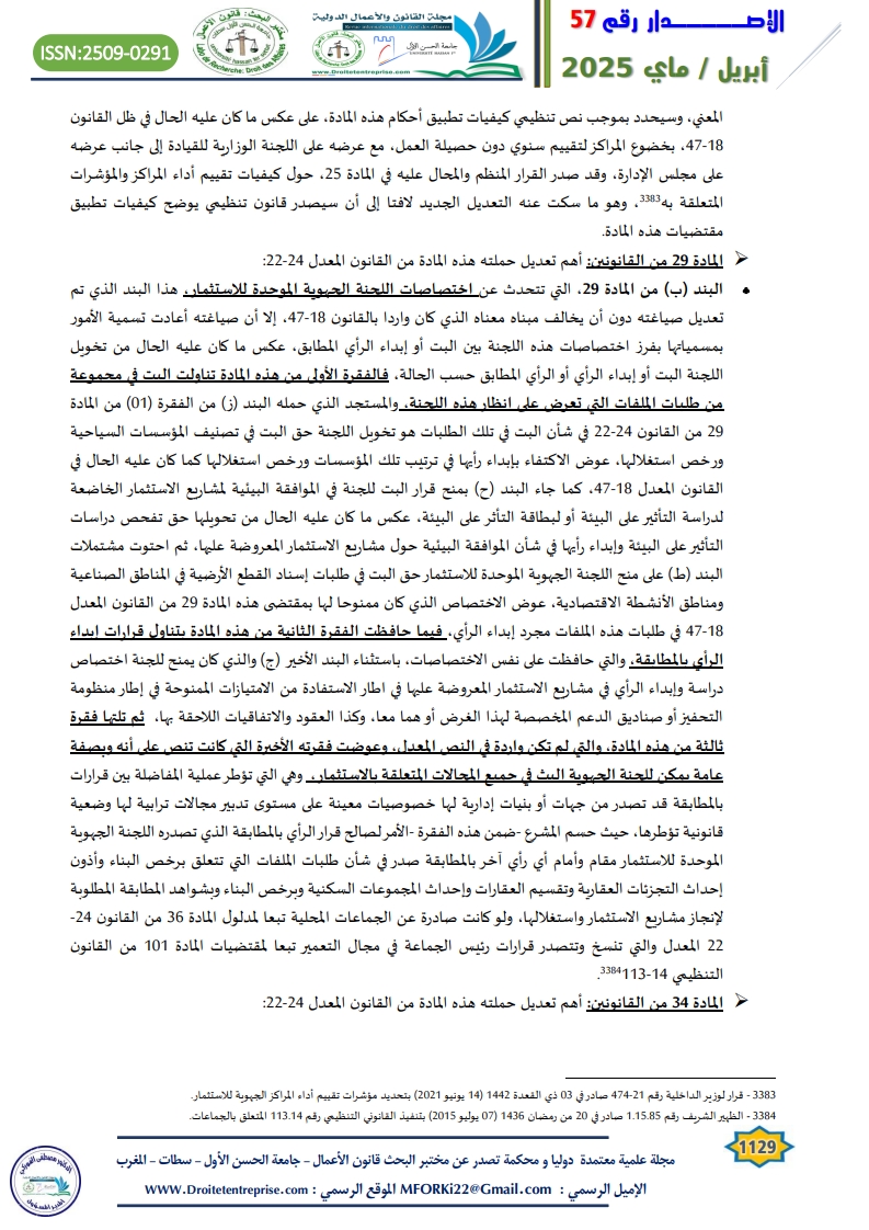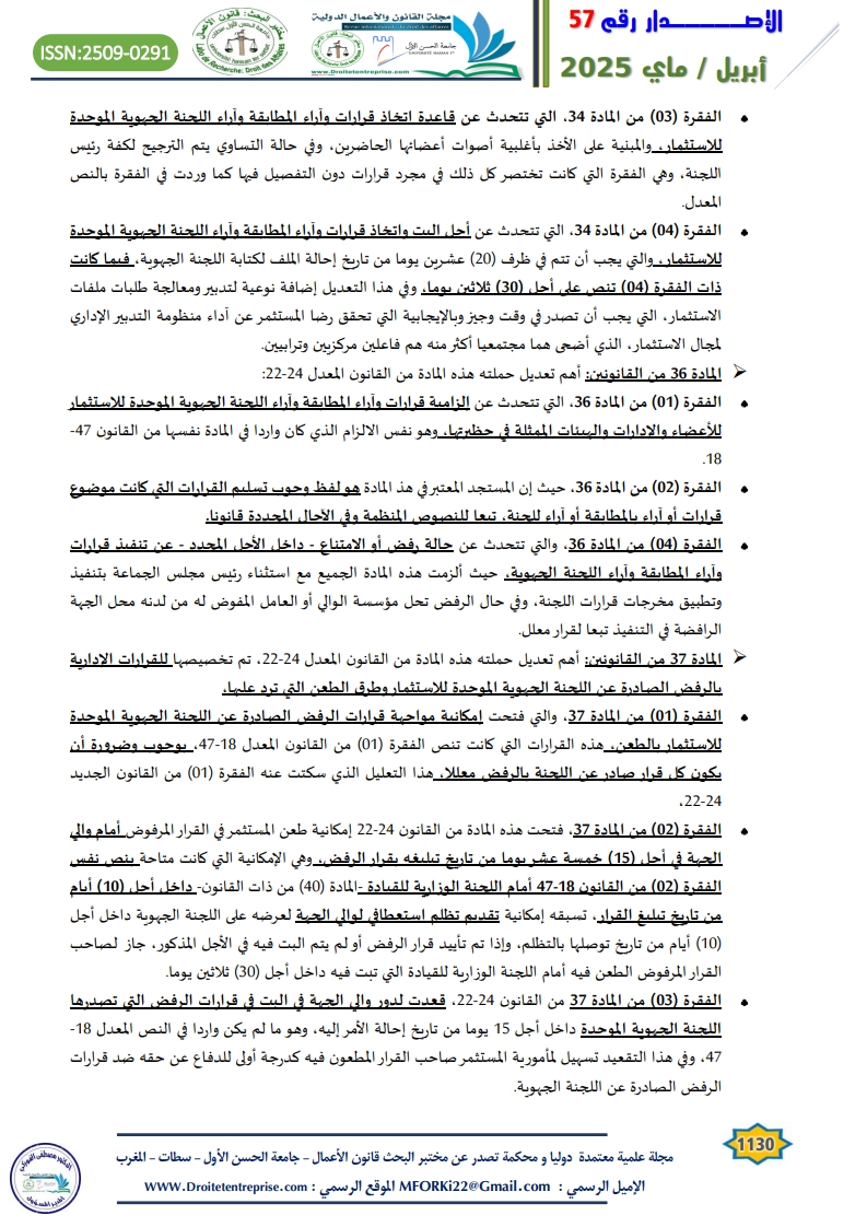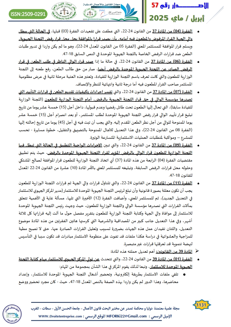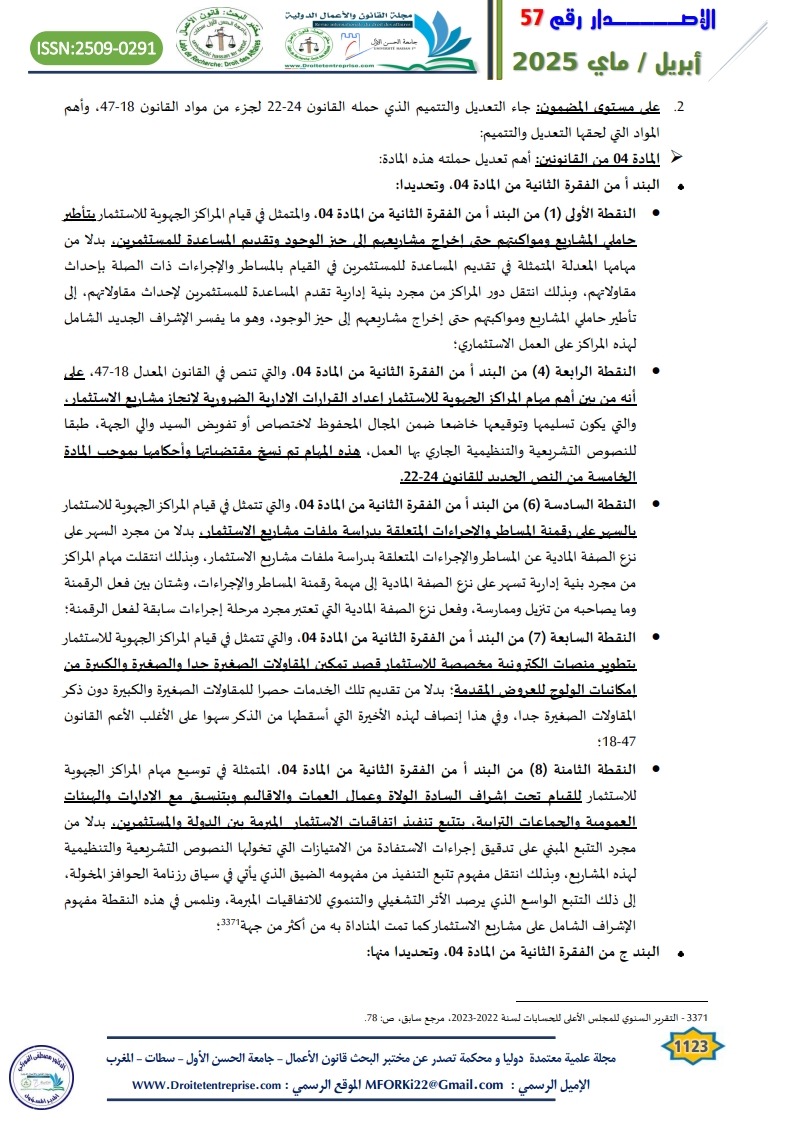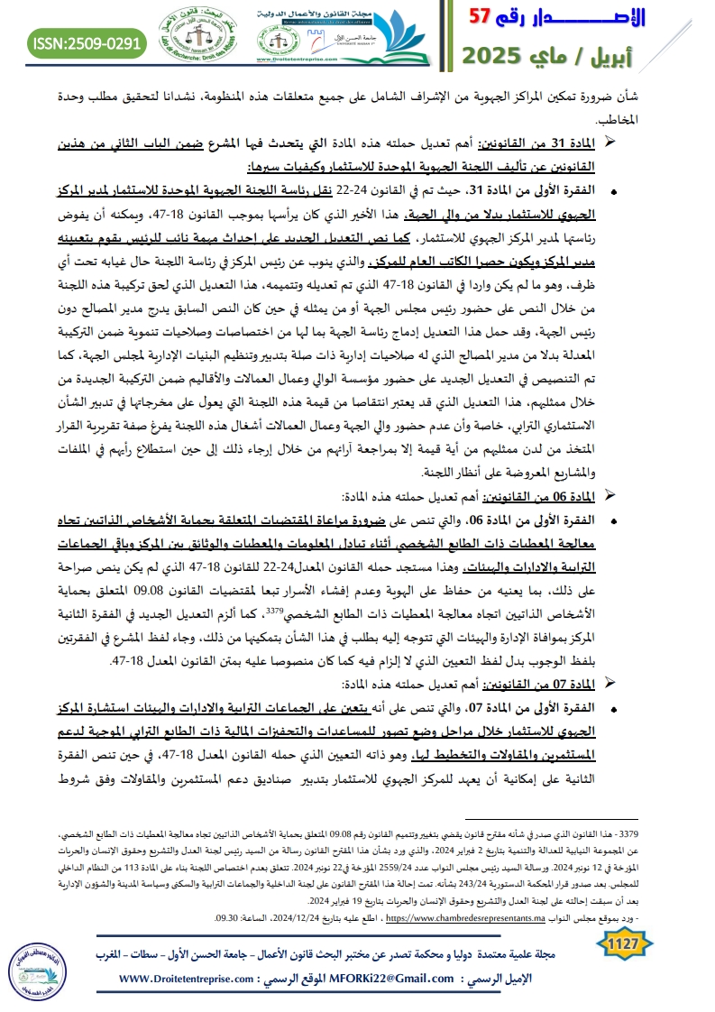This paper attempts to provide a comparative reading between the two laws regulating the work of regional investment centers and unified regional investment committees, the soon-to-be-terminated law 47-18, after Law 22-24 – amending, modifying and supplementing the expired law – received ratified by Parliament on 09 December 2024, these two laws were designed to establish an optimal management of regional investment centers as an administrative structure in charge of investment and a single point of contact for its contents and related matters, based on a set of reform imperatives that were called for from within the regional centers themselves through their proposals submitted to the ministerial leadership committee (for appeals against the ratified amendment), and other imperatives raised by Governance institutions to evaluate the work and management of these centers, to bring them in line with the various developments in the legislative and regulatory framework of our country’s investment system, which is racing against time to achieve the ceiling of 550 billion dirhams of investment and create 500 thousand jobs during the period between 2022 and 2026, as well as Vision 2035 regarding the redistribution and sharing of the investment map between the private sector, which is hoped to reach two-thirds against one-third for the public sector.