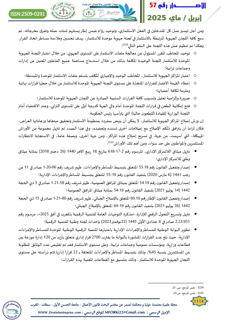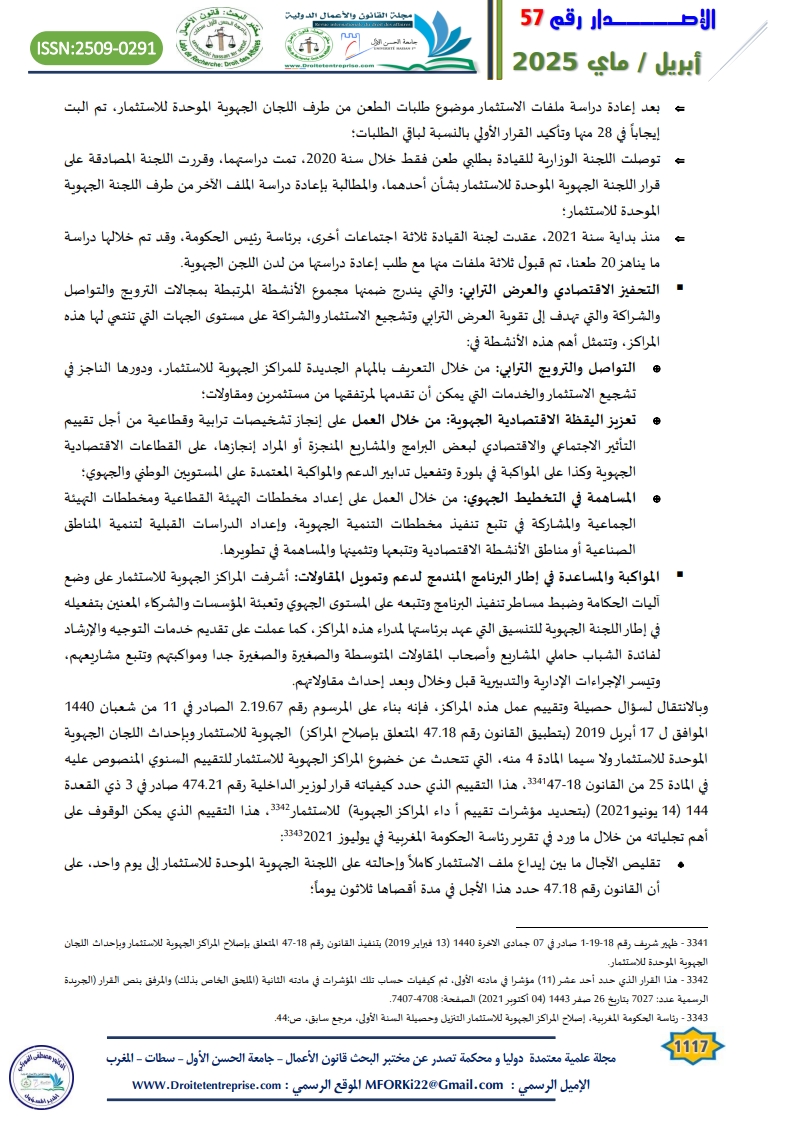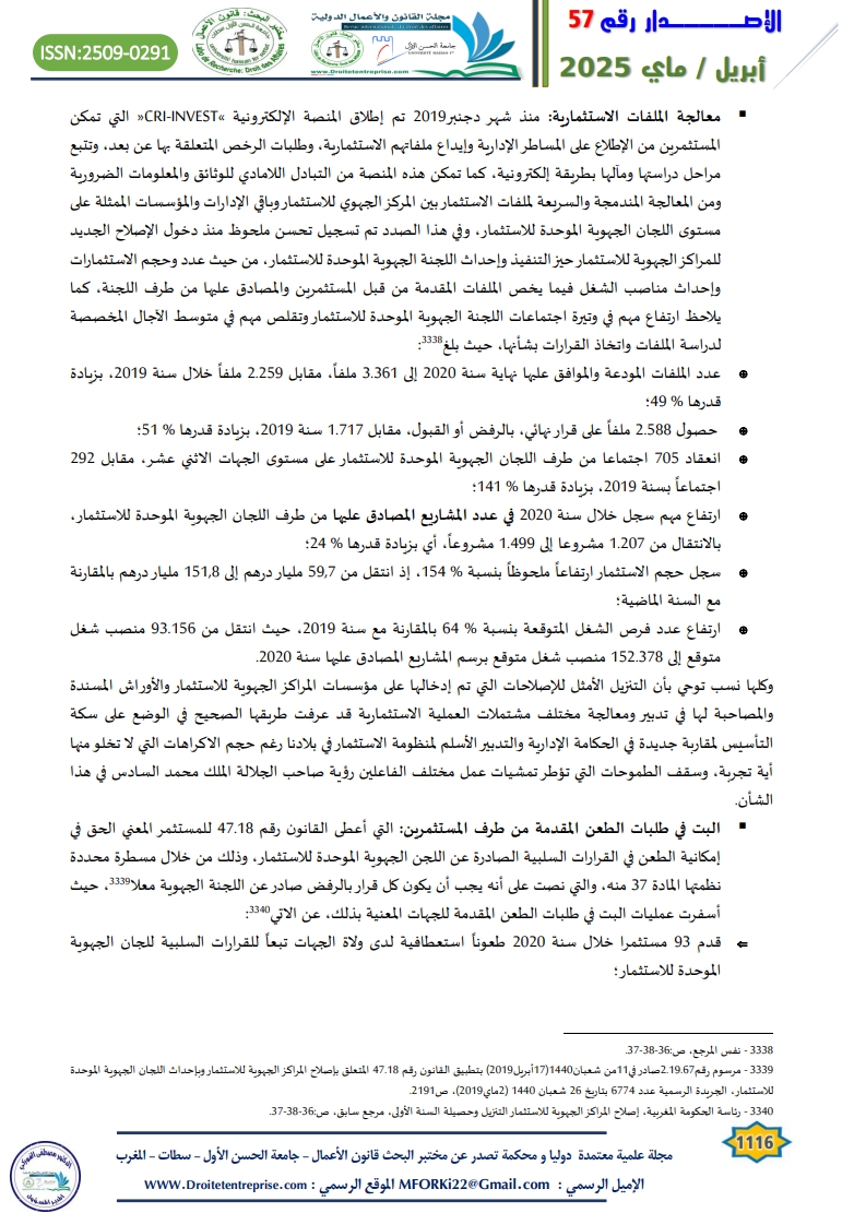 [27] – مرسوم رقم2.19.67صادر في11من شعبان1440(17أبريل2019) بتطبيق القانون رقم 47.18 المتعلق بإصلاح المراكز الجهوية للاستثمار وبإحداث اللجان الجهوية الموحدة للاستثمار، الجريدة الرسمية عدد 6774 بتاريخ 26 شعبان 1440 (2ماي2019)، ص2191.