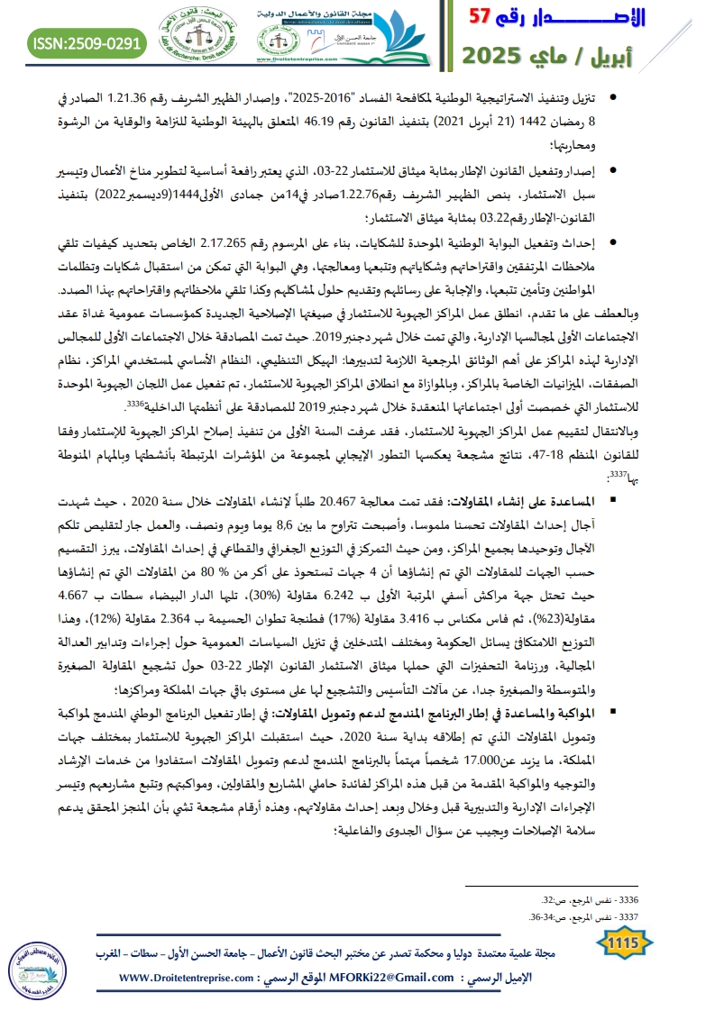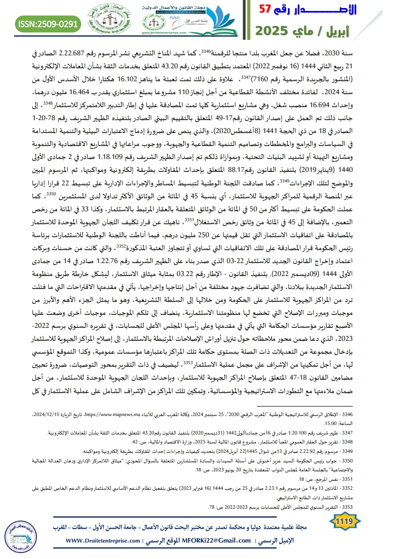 [58] – حصيلة العمل الحكومي 2017-2021: تطوير الاقتصاد والنهوض بالتشغيل، النهوض بالاستثمار ودعم المقاولات، منشور بموقع رئاسة الحكومة المغربية، https://www.cg.gov.ma ، اطلع عليه بتاريخ: 11/12/2024، الساعة: 21.30.