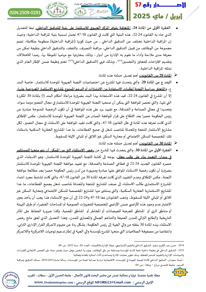 [1] – هو القانون الذي صدرت صيغته التنفيذية بمقتضى الظهير الشريف رقم 68-24-1 الصادر في 18 من جمادى الآخرة 1446 (20 ديسمبر 2024) بتنفيذ القانون رقم 24-22 بتغيير وتتميم القانون رقم 18-47 المتعلق بإصلاح المراكز الجهوية للاستثمار وبإحداث اللجان الجهوية الموحدة للاستثمار، الجريدة الرسمية عدد: 7365، الصفحة: 10631-10636، بتاريخ: 30/12/2024.