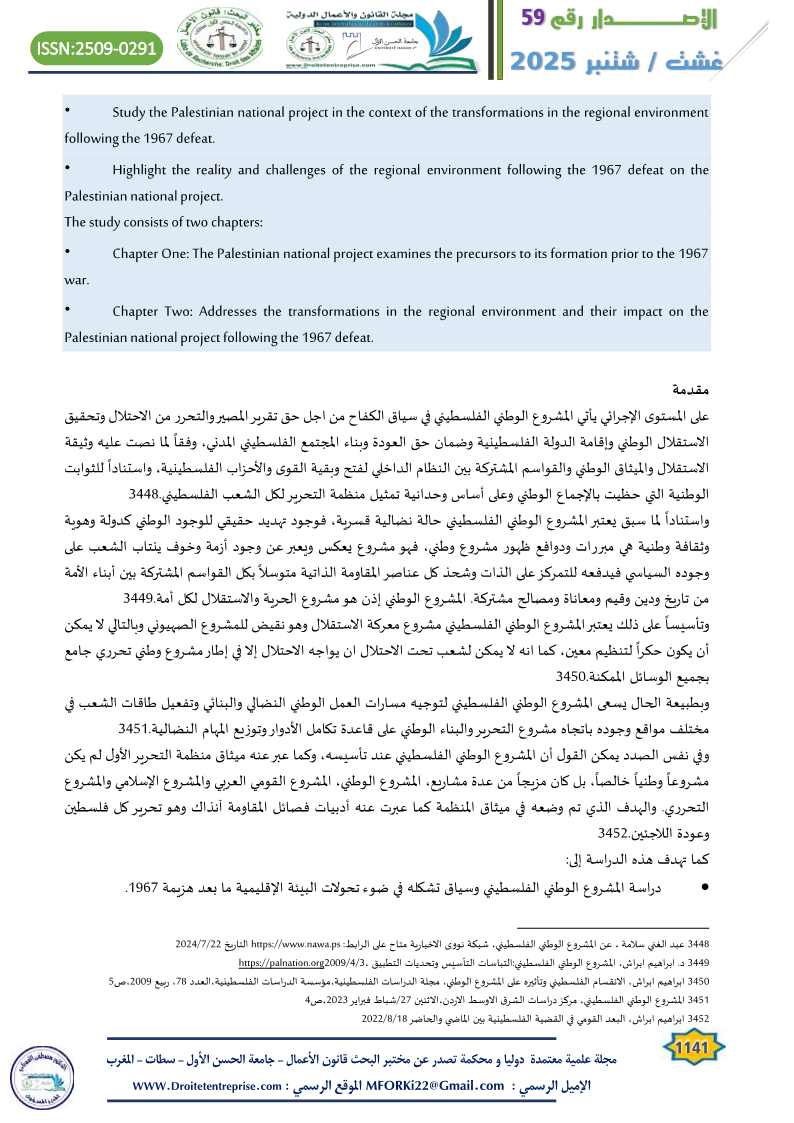 It is noted that the defeat of 1967 led to radical regional changes that greatly affected the Palestinian national project, represented by the pursuit of a Palestinian entity that created disagreements over leadership and the approach that the factions would follow, whether under the umbrella of the PLO or outside it, to achieve their goals of liberating Palestine. This later contributed to the existence of differences and disparities in the definition of Palestine that needed to be liberated and its geographical borders, in addition to the definition of who is a Palestinian, and the goals of the national project to liberate historical Palestine, or to be satisfied with the borders of 1967 to establish the state. Accordingly, the importance of the study comes from the fact that it sheds light on the study and analysis of the transformations of the regional environment after the defeat of 1967 and their impact on the Palestinian national project.