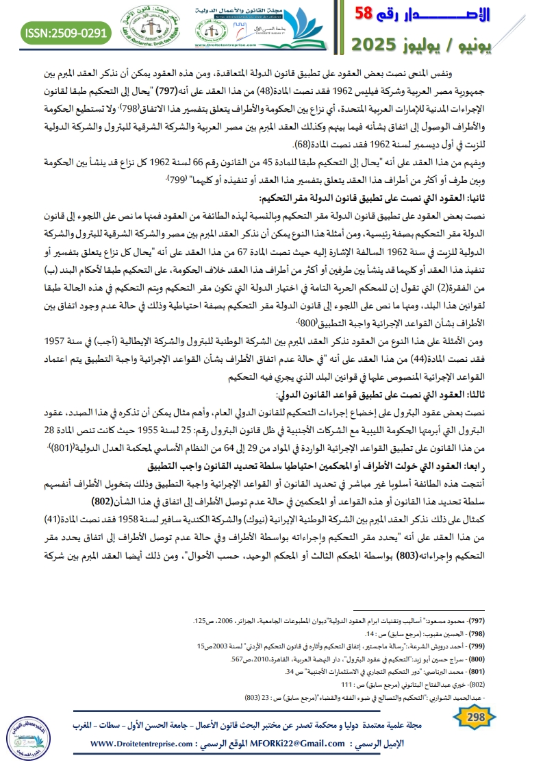 ونفس المنحى نصت بعض العقود على تطبيق قانون الدولة المتعاقدة، ومن هذه العقود يمكن أن نذكر العقد المبرم بين جمهورية مصر العربية وشركة فيليس 1962 فقد نصت المادة(48) من هذا العقد على أنه([27]) “يحال إلى التحكيم طبقا لقانون الإجراءات المدنية للإمارات العربية المتحدة، أي نزاع بين الحكومة والأطراف يتعلق بتفسير هذا الاتفاق([28])، ولا تستطيع الحكومة والأطراف الوصول إلى اتفاق بشأنه فيما بينهم وكذلك العقد المبرم بين مصر العربية والشركة الشرقية للبترول والشركة الدولية للزيت في أول ديسمبر لسنة 1962 فقد نصت المادة(68).