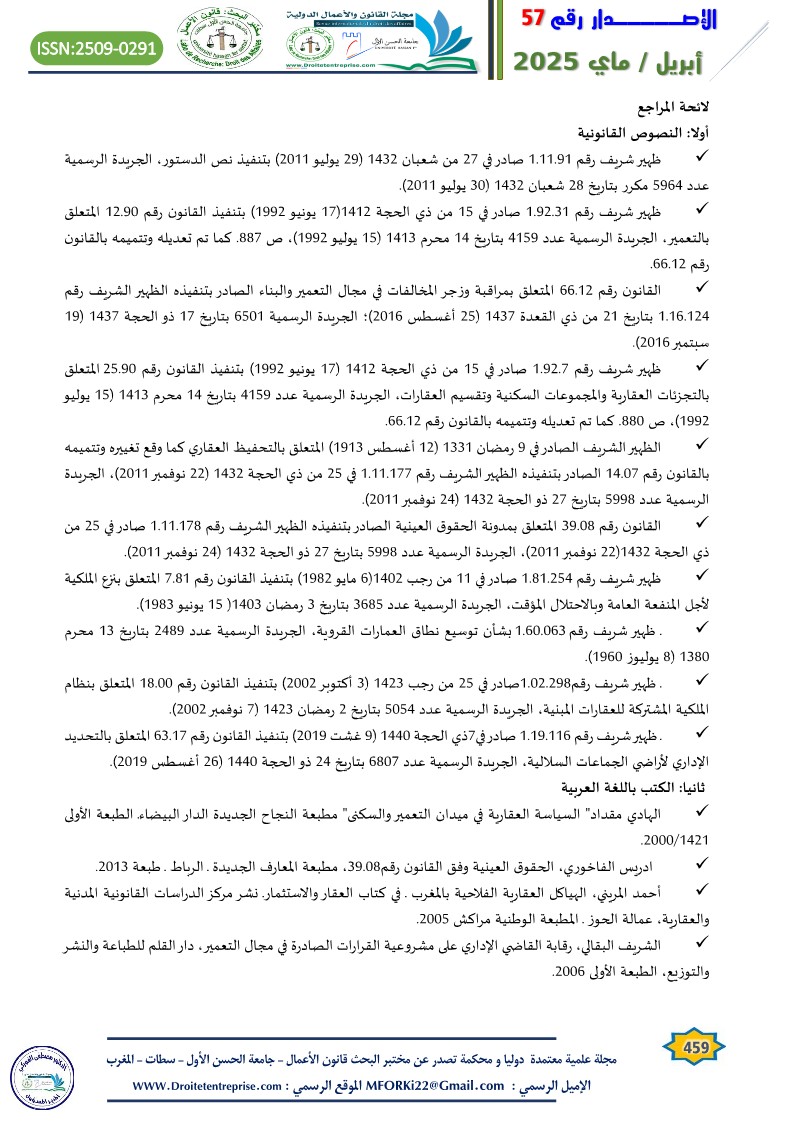 [5] ظهير شريف رقم 1.92.7 صادر في 15 من ذي الحجة 1412(17 يونيو 1992) بتنفيذ القانون رقم 25.90 المتعلق بالتجزئات العقارية والمجموعات السكنية وتقسيم العقارات، الجريدة الرسمية عدد 4159 بتاريخ 14 محرم 1413(15 يوليوز 1992)، ص