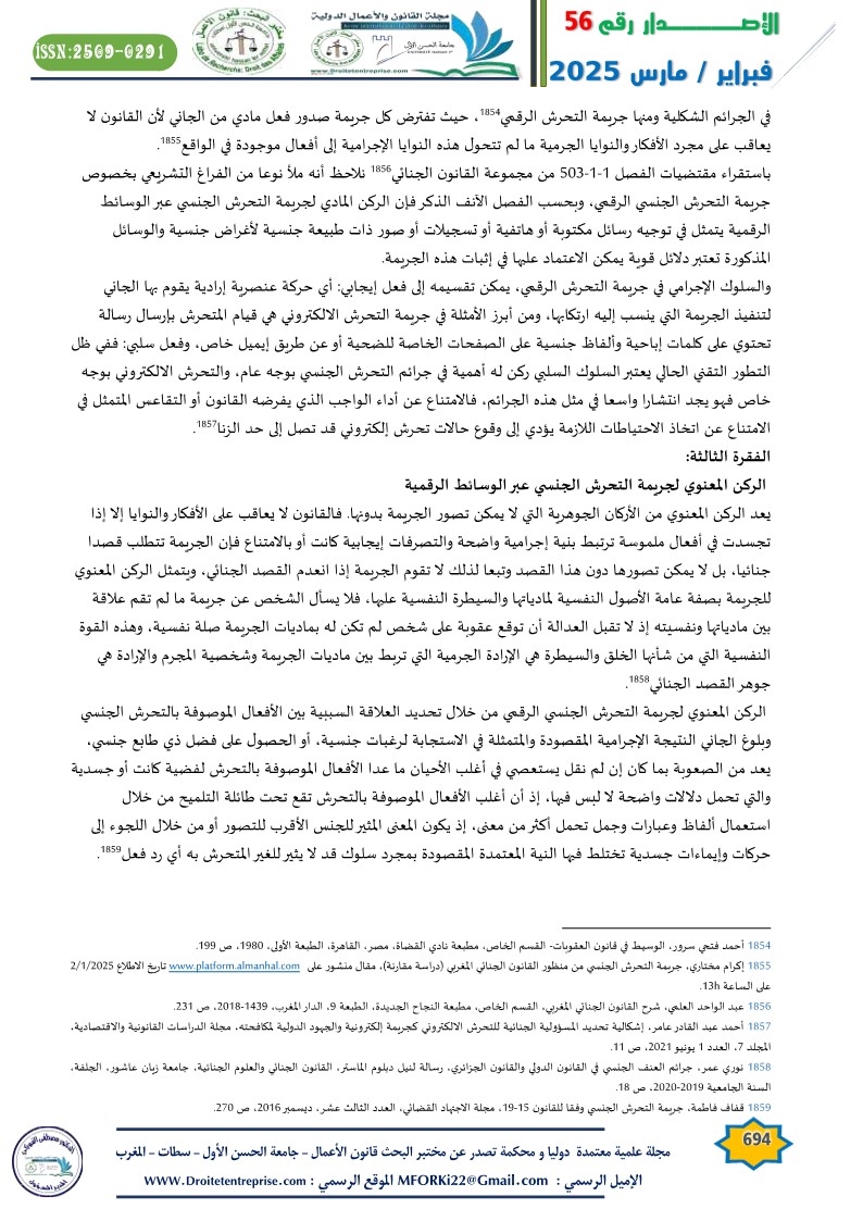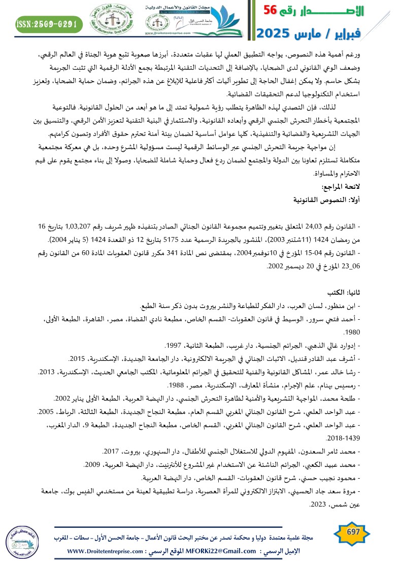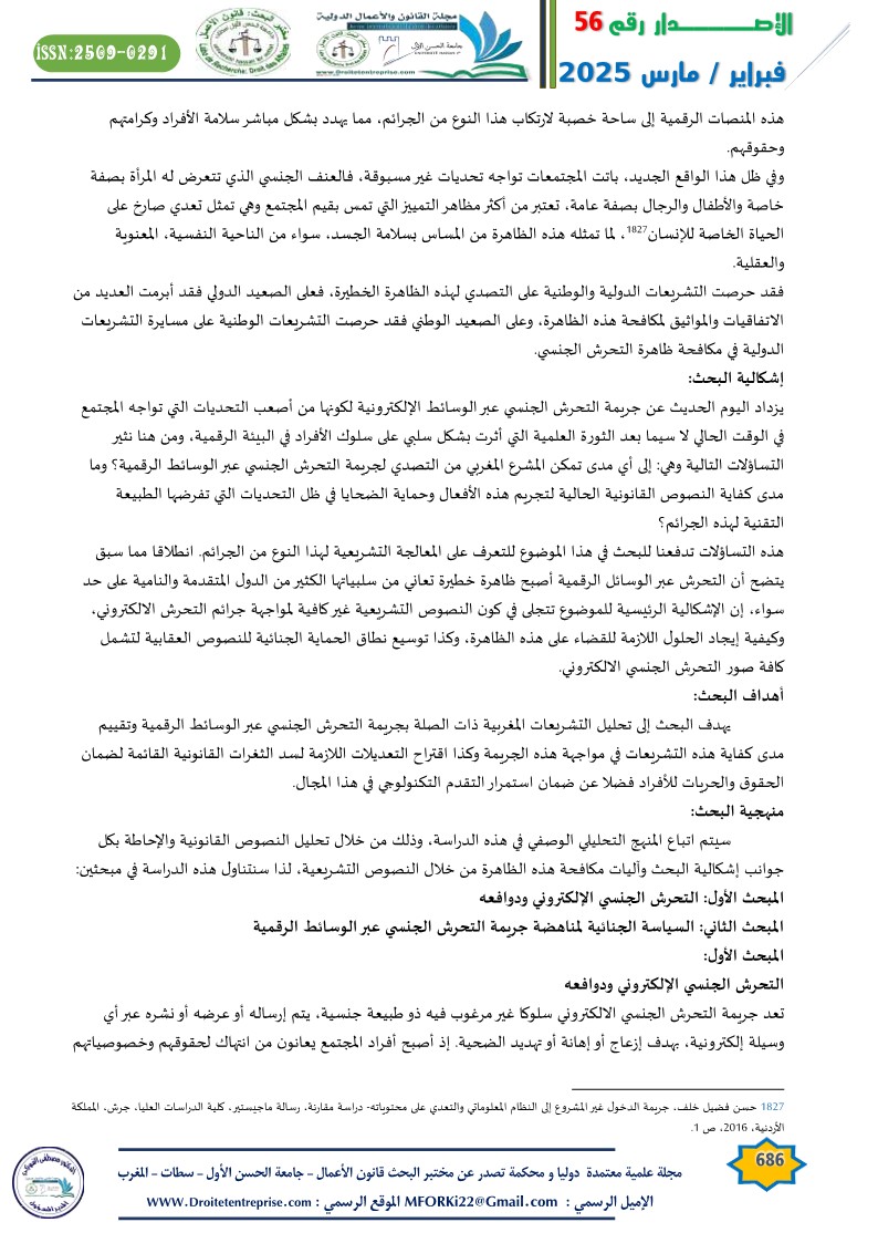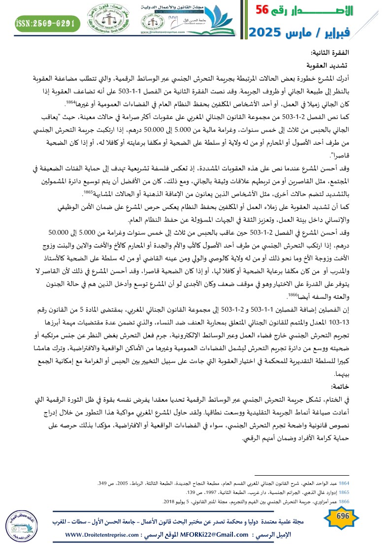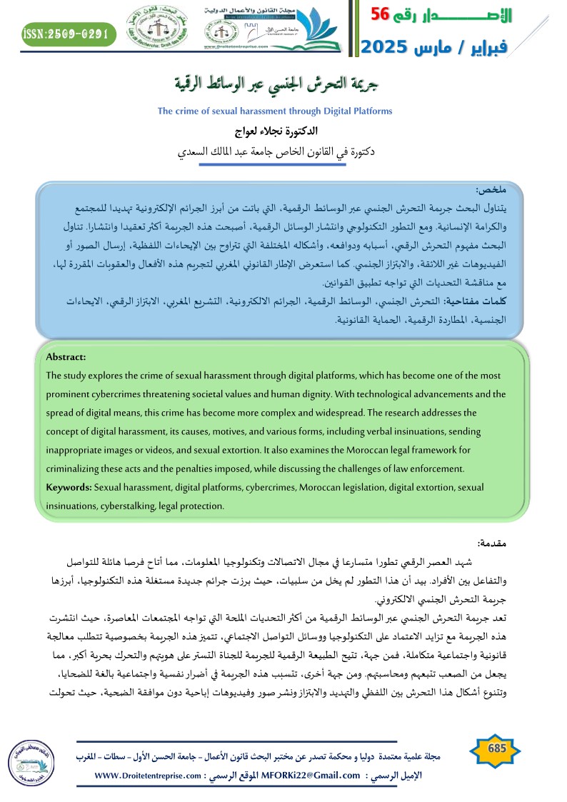 كلمات مفتاحية: التحرش الجنسي، الوسائط الرقمية، الجرائم الالكترونية، التشريع المغربي، الابتزاز الرقمي، الايحاءات الجنسية، المطاردة الرقمية، الحماية القانونية.