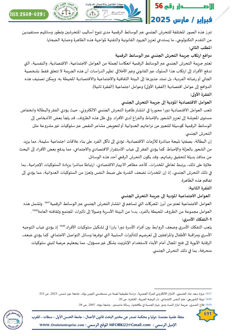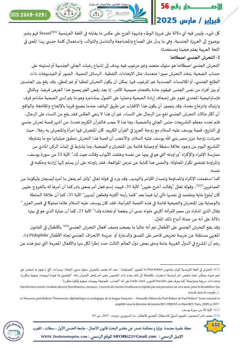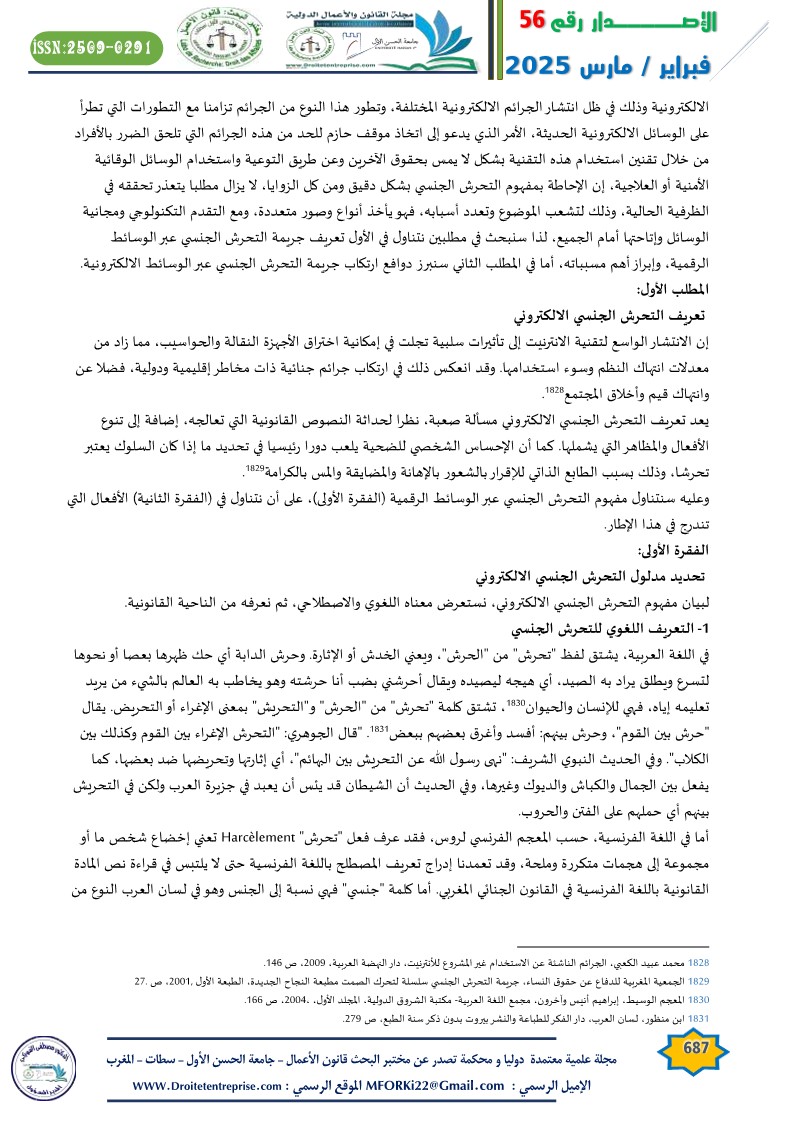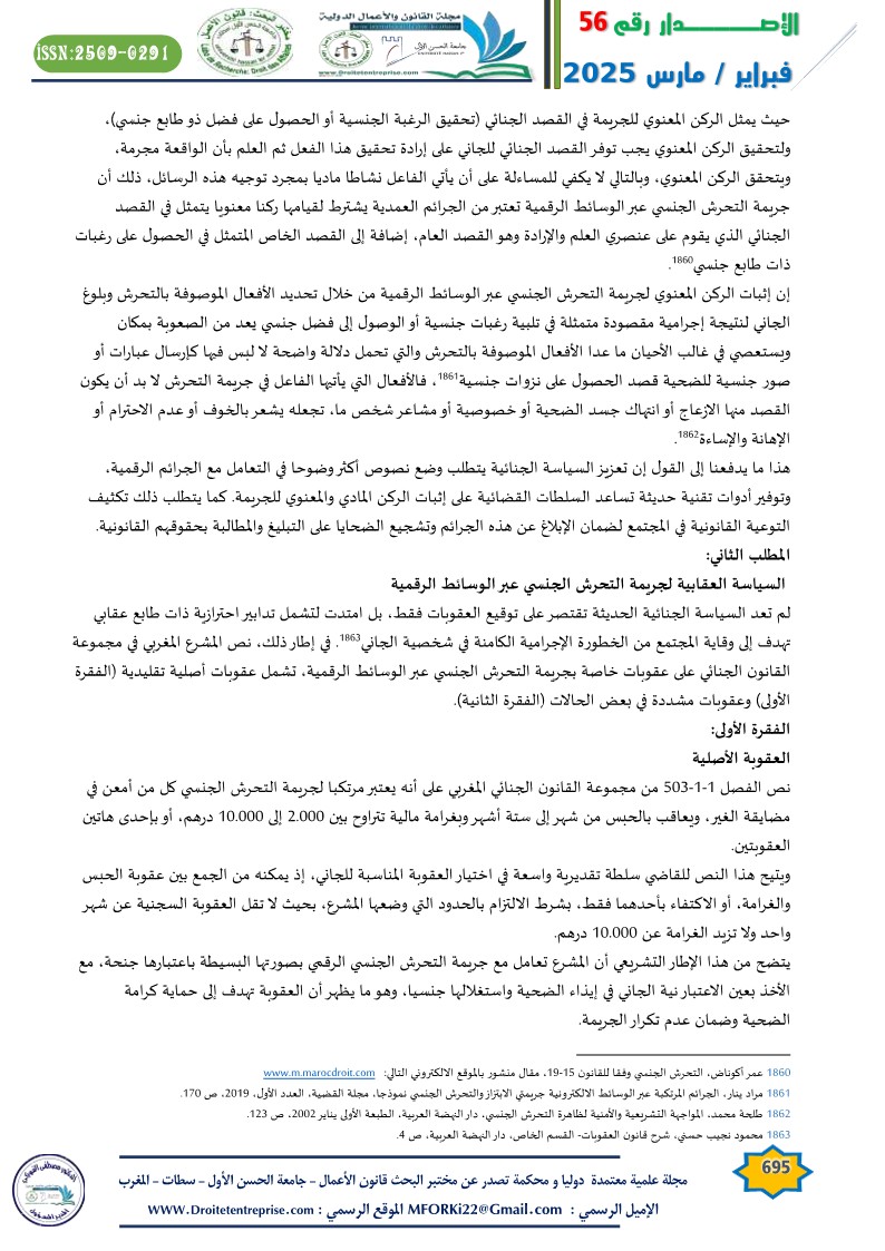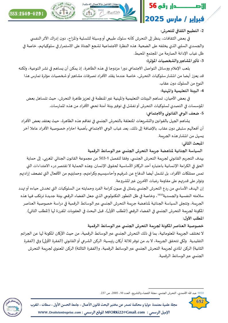 كلمات مفتاحية: التحرش الجنسي، الوسائط الرقمية، الجرائم الالكترونية، التشريع المغربي، الابتزاز الرقمي، الايحاءات الجنسية، المطاردة الرقمية، الحماية القانونية.