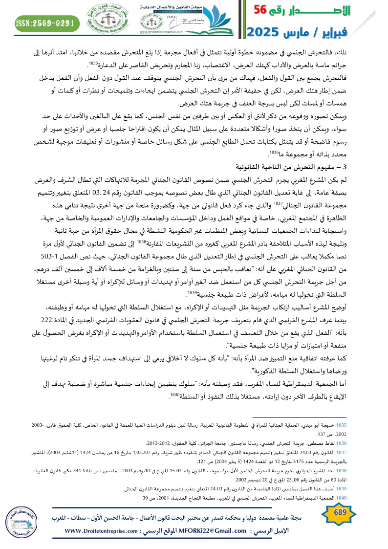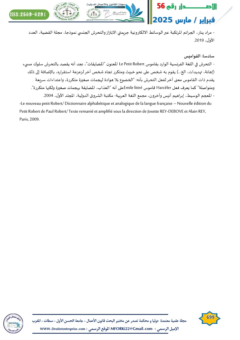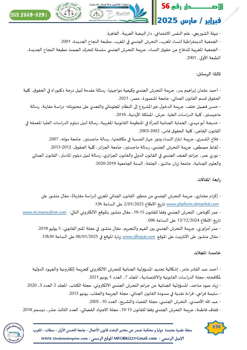 – إكرام مختاري، جريمة التحرش الجنسي من منظور القانون الجنائي المغربي (دراسة مقارنة)، مقال منشور على www.platform.almanhal.com تاريخ الاطلاع 2/01/2025 على الساعة 13h.