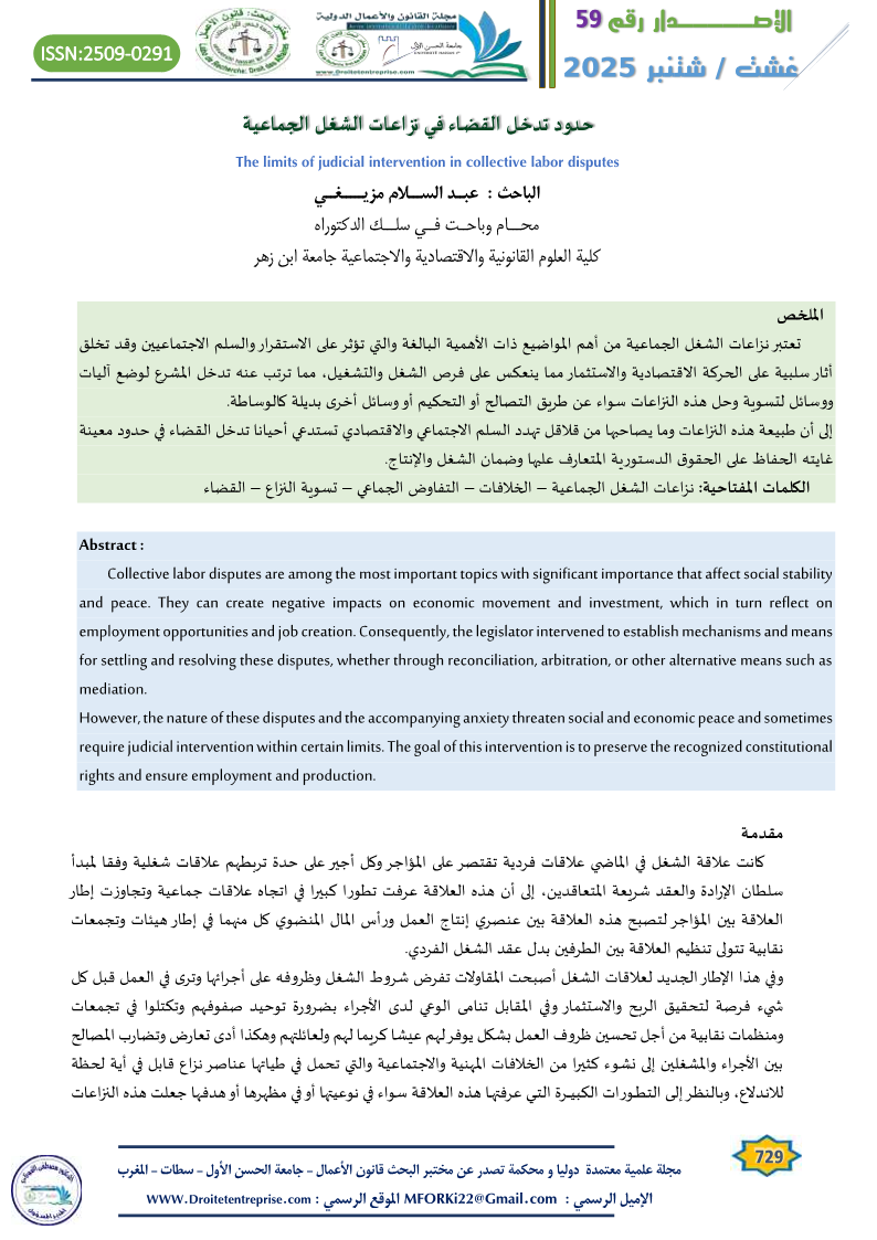 تعتبر نزاعات الشغل الجماعية من أهم المواضيع ذات الأهمية البالغة والتي تؤثر على الاستقرار والسلم الاجتماعيين وقد تخلق أثار سلبية على الحركة الاقتصادية والاستثمار مما ينعكس على فرص الشغل والتشغيل، مما ترتب عنه تدخل المشرع لوضع آليات ووسائل لتسوية وحل هذه النزاعات سواء عن طريق التصالح أو التحكيم أو وسائل أخرى بديلة كالوساطة. إلى أن طبيعة هذه النزاعات وما يصاحبها من قلاقل تهدد السلم الاجتماعي والاقتصادي تستدعي أحيانا تدخل القضاء في حدود معينة غايته الحفاظ على الحقوق الدستورية المتعارف عليها وضمان الشغل والإنتاج. الكلمات المفتاحية: نزاعات الشغل الجماعية – الخلافات – التفاوض الجماعي – تسوية النزاع – القضاء Abstract : Collective labor disputes are among the most important topics with significant importance that affect social stability and peace. They can create negative impacts on economic movement and investment, which in turn reflect on employment opportunities and job creation. Consequently, the legislator intervened to establish mechanisms and means for settling and resolving these disputes, whether through reconciliation, arbitration, or other alternative means such as mediation. However, the nature of these disputes and the accompanying anxiety threaten social and economic peace and sometimes require judicial intervention within certain limits. The goal of this intervention is to preserve the recognized constitutional rights and ensure employment and production. |