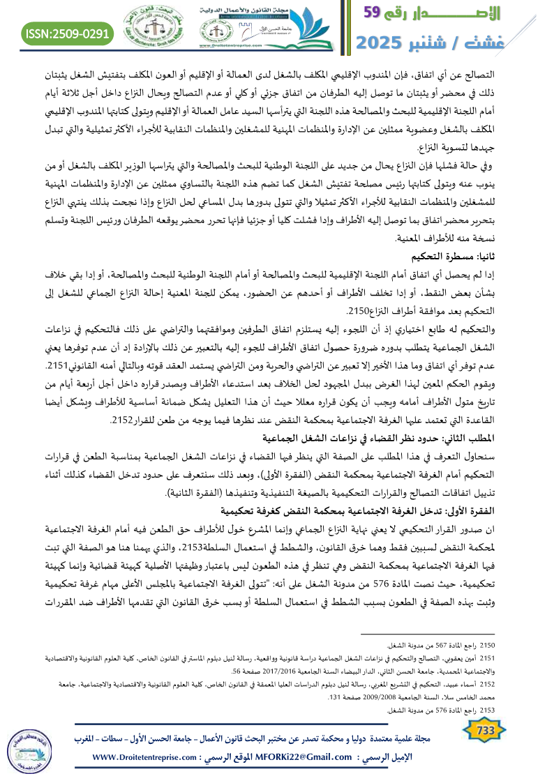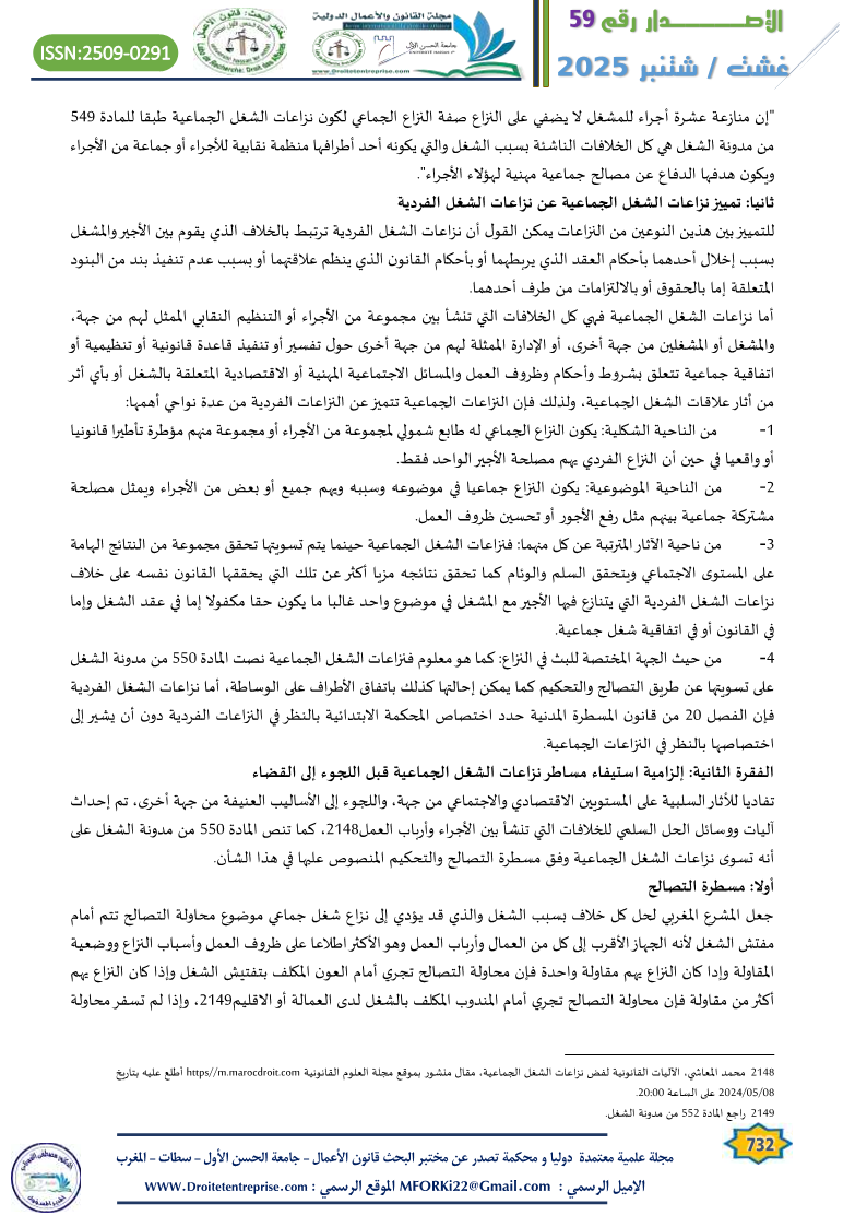 - محمد المعاشي، الآليات القانونية لفض نزاعات الشغل الجماعية، مقال منشور بموقع مجلة العلوم القانونية https//m.marocdroit.com أطلع عليه بتاريخ 08/05/2024 على الساعة 20:00. ↑