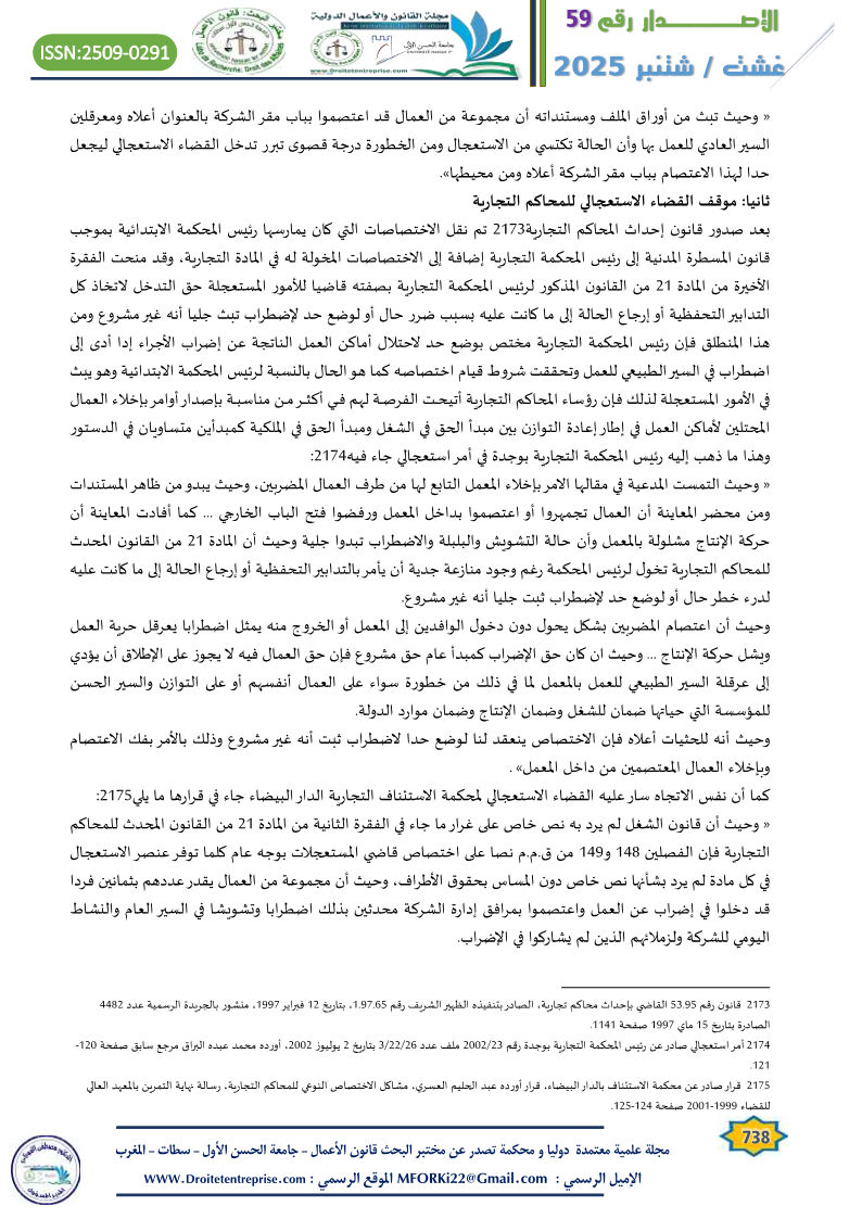 » وحيث أن قانون الشغل لم يرد به نص خاص على غرار ما جاء في الفقرة الثانية من المادة 21 من القانون المحدث للمحاكم التجارية فإن الفصلين 148 و149 من ق.م.م نصا على اختصاص قاضي المستعجلات بوجه عام كلما توفر عنصر الاستعجال في كل مادة لم يرد بشأنها نص خاص دون المساس بحقوق الأطراف، وحيث أن مجموعة من العمال يقدر عددهم بثمانين فردا قد دخلوا في إضراب عن العمل واعتصموا بمرافق إدارة الشركة محدثين بذلك اضطرابا وتشويشا في السير العام والنشاط اليومي للشركة ولزملائهم الذين لم يشاركوا في الإضراب.