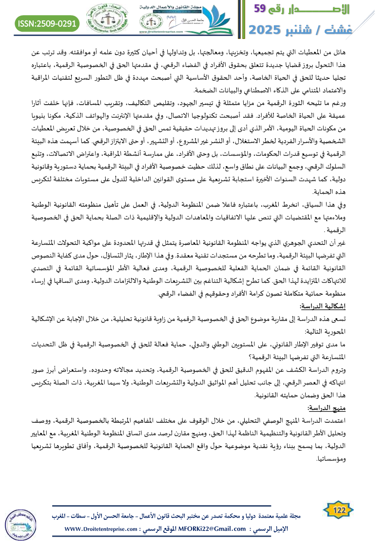 وتروم الدراسة الكشف عن المفهوم الدقيق للحق في الخصوصية الرقمية، وتحديد مجالاته وحدوده، واستعراض أبرز صور انتهاكه في العصر الرقمي، إلى جانب تحليل أهم المواثيق الدولية والتشريعات الوطنية، ولا سيما المغربية، ذات الصلة بتكريس هذا الحق وضمان حمايته القانونية.