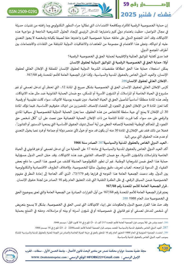الكلمات المفتاحية: الحق في الخصوصية الرقمية، الفضاء الرقمي، المواثيق الدولية والإقليمية لحقوق الإنسان، القوانين المغربية.