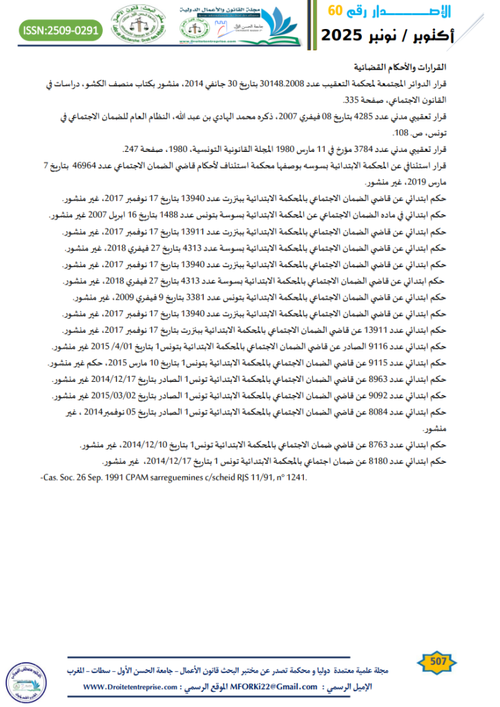 قرار تعقيبي مدني عدد 4285 بتاريخ 08 فيفري 2007، ذكره محمد الهادي بن عبد الله، النظام العام للضمان الاجتماعي في تونس، ص. 108.