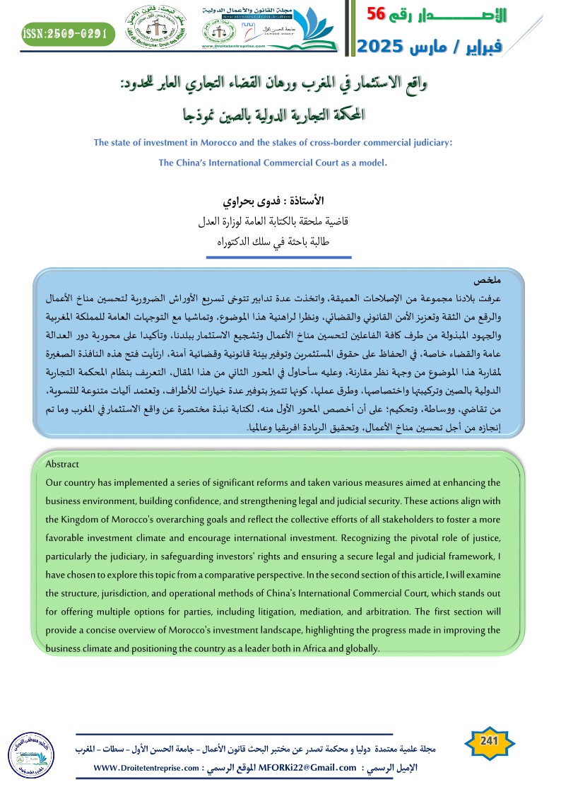 واقع الاستثمار في المغرب ورهان القضاء التجاري العابر للحدود: المحكمة التجارية الدولية بالصين نموذجا الأستاذة : فدوى بحراوي