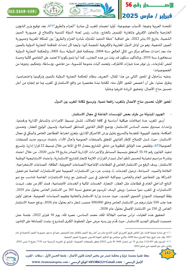 عرفت بلادنا مجموعة من الإصلاحات العميقة، واتخذت عدة تدابير تتوخى تسريع الأوراش الضرورية لتحسين مناخ الأعمال والرقع من الثقة وتعزيز الأمن القانوني والقضائي، ونظرا لراهنية هذا الموضوع، وتماشيا مع التوجهات العامة للمملكة المغربية والجهود المبذولة من طرف كافة الفاعلين لتحسين مناخ الأعمال وتشجيع الاستثمار ببلدنا، وتأكيدا على محورية دور العدالة عامة والقضاء خاصة، في الحفاظ على حقوق المستثمرين وتوفير بيئة قانونية وقضائية آمنة، ارتأيت فتح هذه النافذة الصغيرة لمقاربة هذا الموضوع من وجهة نظر مقارنة، وعليه سأحاول في المحور الثاني من هذا المقال، التعريف بنظام المحكمة التجارية الدولية بالصين وتركيبتها واختصاصها، وطرق عملها، كونها تتميز بتوفير عدة خيارات للأطراف، وتعتمد آليات متنوعة للتسوية، من تقاضي، ووساطة، وتحكيم؛ على أن أخصص المحور الأول منه، لكتابة نبذة مختصرة عن واقع الاستثمار في المغرب وما تم إنجازه من أجل تحسين مناخ الأعمال، وتحقيق الريادة افريقيا وعالميا.
