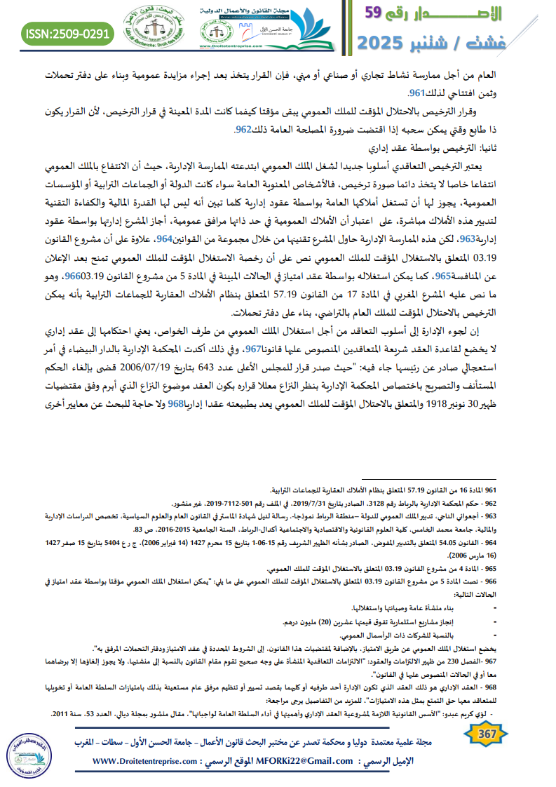 يعتبر الترخيص التعاقدي أسلوبا جديدا لشغل الملك العمومي ابتدعته الممارسة الإدارية، حيث أن الانتفاع بالملك العمومي انتفاعا خاصا لا يتخذ دائما صورة ترخيص، فالأشخاص المعنوية العامة سواء كانت الدولة أو الجماعات الترابية أو المؤسسات العمومية، يجوز لها أن تستغل أملاكها العامة بواسطة عقود إدارية كلما تبين أنه ليس لها القدرة المالية والكفاءة التقنية لتدبير هذه الأملاك مباشرة، على اعتبار أن الأملاك العمومية في حد ذاتها مرافق عمومية، أجاز المشرع إدارتها بواسطة عقود إدارية[31]، لكن هذه الممارسة الإدارية حاول المشرع تقنينها من خلال مجموعة من القوانين[32]، علاوة على أن مشروع القانون 03.19 المتعلق بالاستغلال المؤقت للملك العمومي نص على أن رخصة الاستغلال المؤقت للملك العمومي تمنح بعد الإعلان عن المنافسة[33]، كما يمكن استغلاله بواسطة عقد امتياز في الحالات المبينة في المادة 5 من مشروع القانون 03.19[34]، وهو ما نص عليه المشرع المغربي في المادة 17 من القانون 57.19 المتعلق بنظام الأملاك العقارية للجماعات الترابية بأنه يمكن الترخيص بالاحتلال المؤقت للملك العام بالتراضي، بناء على دفتر تحملات.