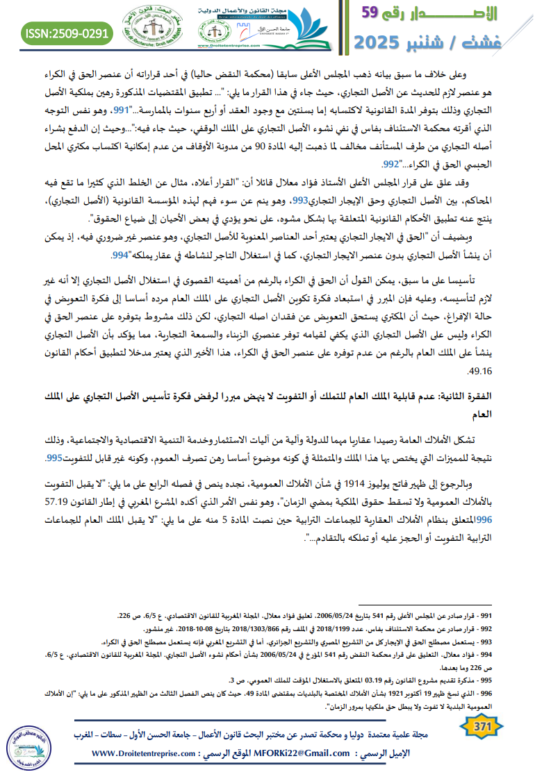 فالاجتهاد القضائي المغربي لا يعترف غالباً بوجود أصل تجاري على الملك العام، لغياب عنصر “الحق في الكراء” كشرط جوهري، مما يخلق نوعا من اللبس في فهم الأحكام القانونية المنظمة للأصل التجاري، على اعتبار أن عنصر الحق في الكراء ليس سوى عنصر ثانوي في نشوء الأصل التجاري إلى جانب مجموعة من العناصر الأخرى كالاسم التجاري والشعار والبضائع وغيرها، مما يفتح النقاش حول ضرورة إعادة النظر في تأويل النصوص القانونية بما يحقق توازناً بين حماية المال العام وتشجيع الاستثمار الخاص.