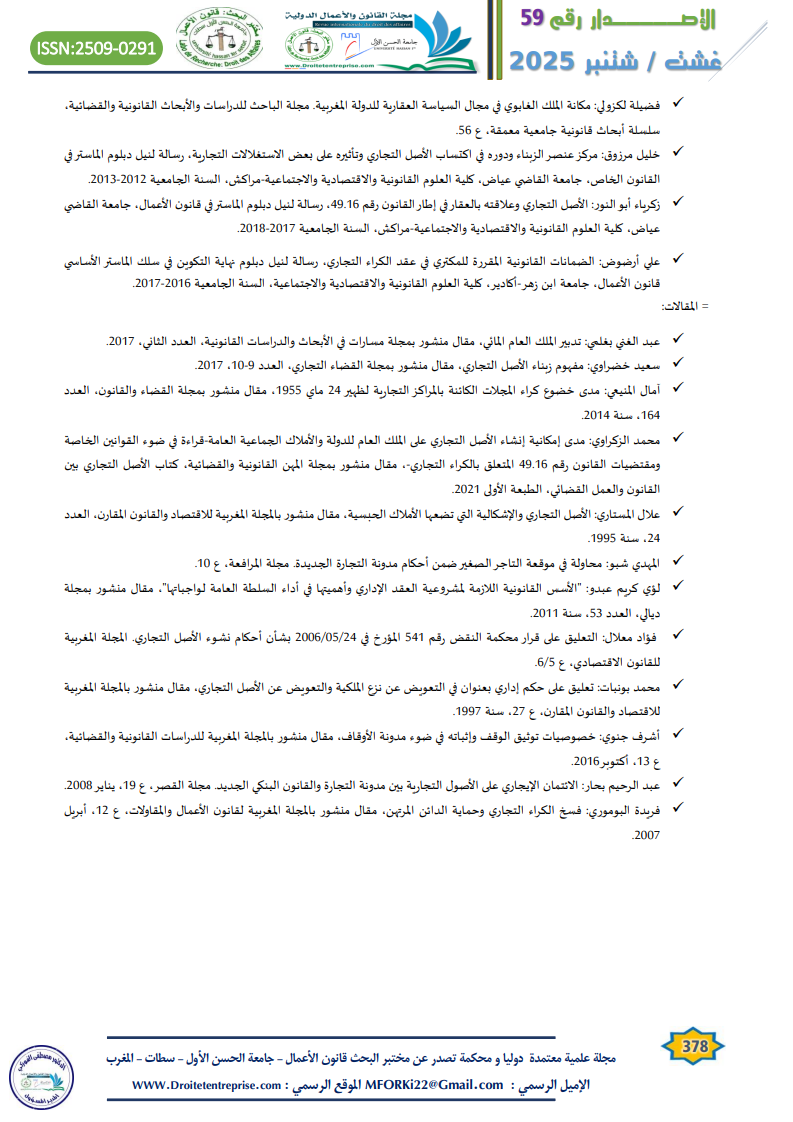 58. – فريدة البوموري: فسخ الكراء التجاري وحماية الدائن المرتهن، م م بالمجلة المغربية لقانون الأعمال والمقاولات، ع 12، أبريل 2007، ص 32.