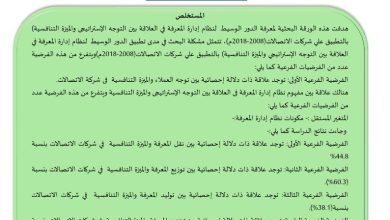 الدور الوسيط لنظام إدارة المعرفة فى العلاقة بين التوجه الإستراتيجى والميزة التنافسية بالتطبيق على شركات الإتصالات 2008م-2018م The Mediator…