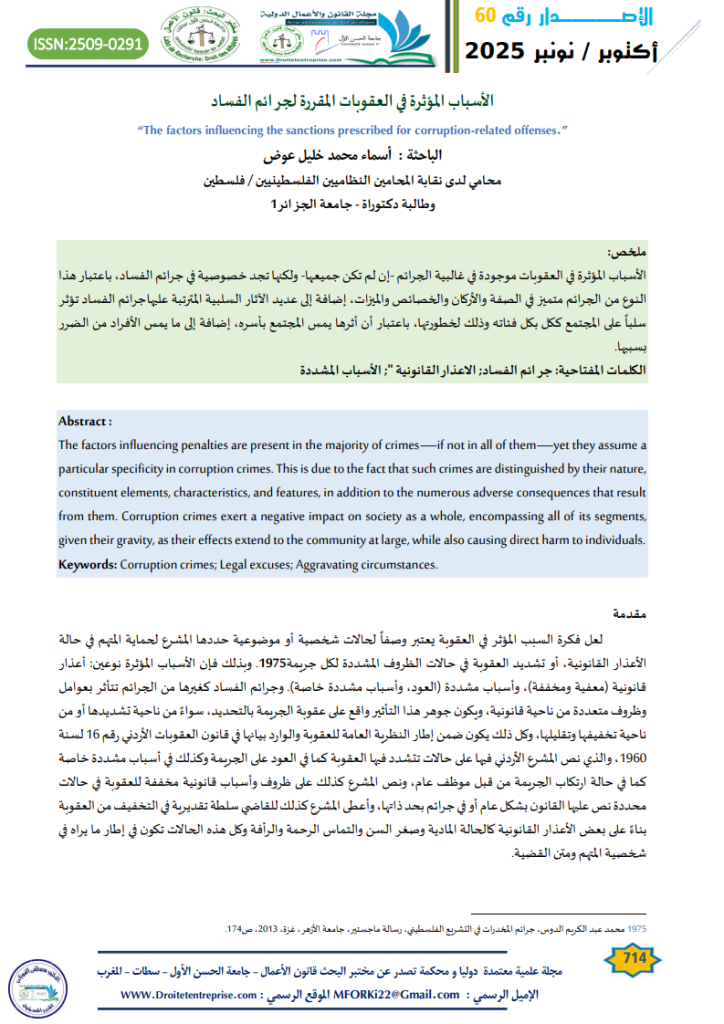 الأسباب المؤثرة في العقوبات المقررة لجرائم الفساد الباحثة : أسماء محمد خليل عوض
