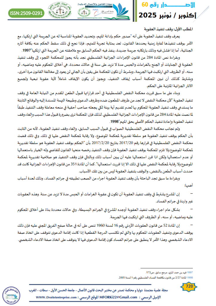 - محمد عبد الله الوريكات، وقف تنفيذ العقوبة المقترن بالاختبار القضائي نظام يفتقده التشريع الجزائي الأردني، مجلة العلوم القانونية والسياسية، الجمعية العلمية للبحوث والدراسات الاستراتيجية، مجلد 1، عدد 2، العراق، 2011، ص202. ↑
