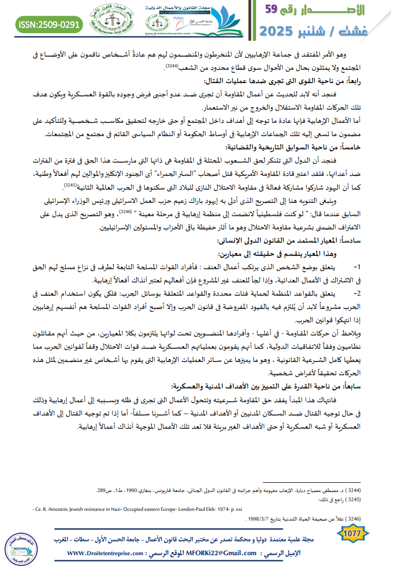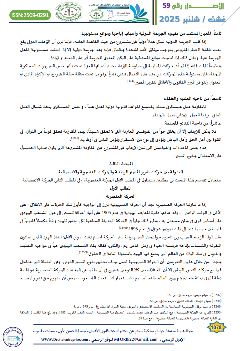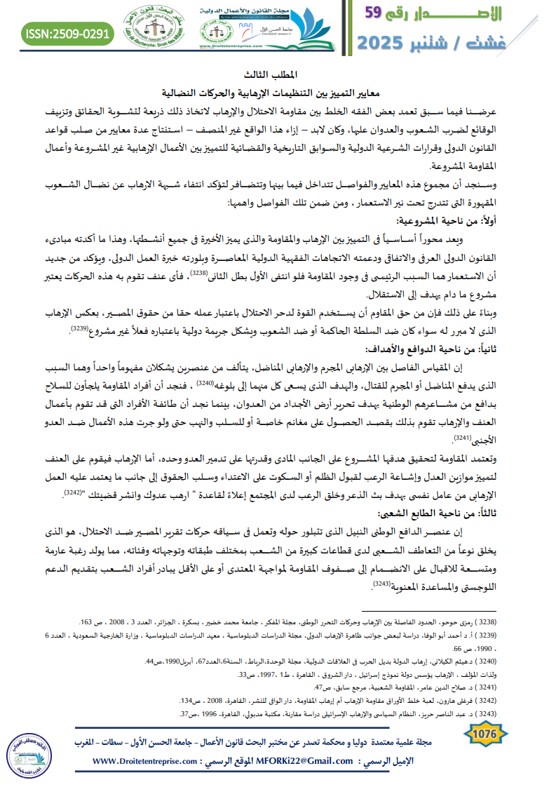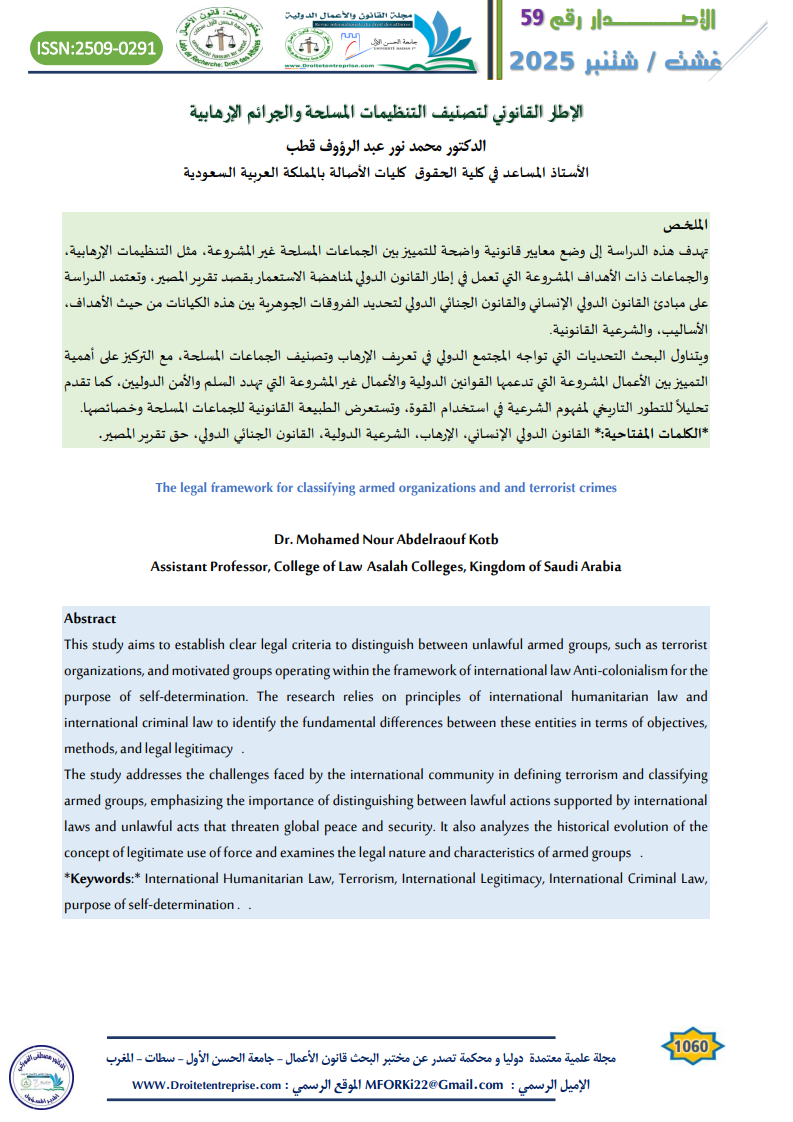 This study aims to establish clear legal criteria to distinguish between unlawful armed groups, such as terrorist organizations, and motivated groups operating within the framework of international law Anti-colonialism for the purpose of self-determination. The research relies on principles of international humanitarian law and international criminal law to identify the fundamental differences between these entities in terms of objectives, methods, and legal legitimacy.
