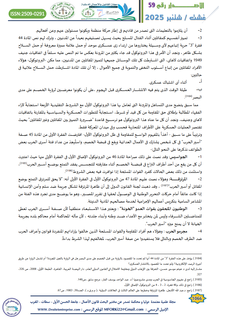 - الالتزام بقواعد القانون الدولى واحترام أعراف الحرب، واكتفى البروتوكول الإضافى الأول([18]) بأن يكون هذا الالتزام بصفة جماعية بمعنى أنه إذا خالف أحدهم القواعد لا تنزع عنه صفة المقاتل أو أسير الحرب.