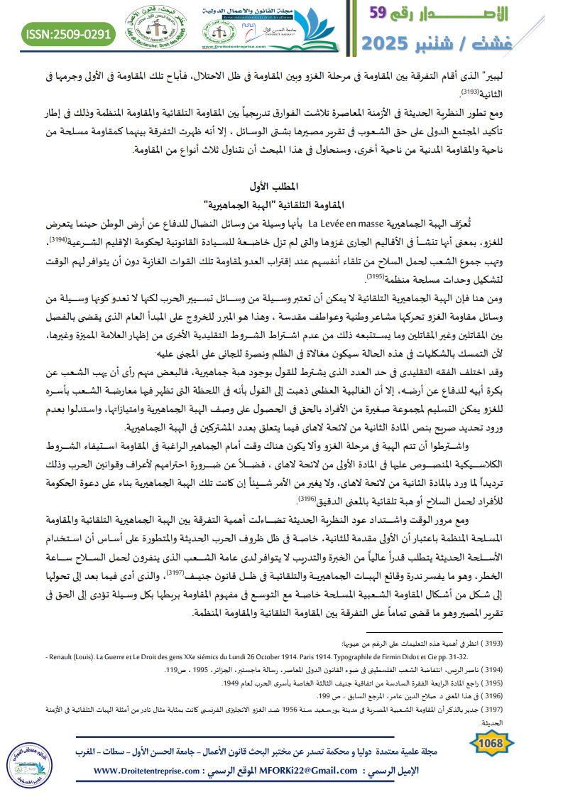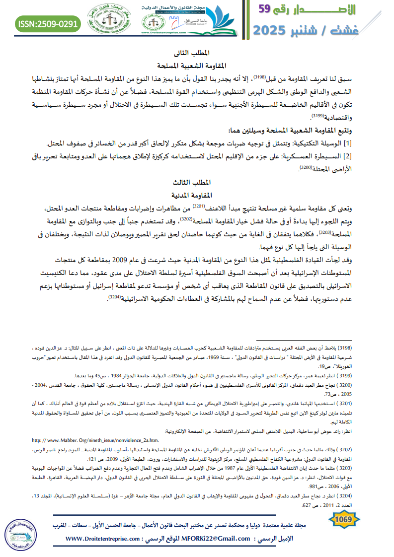 المبحث الأول: التفرقة بين المقاومة الشعبية المسلحة والمقاومة التلقائية والمقاومة المدنية ضد الاحتلال.