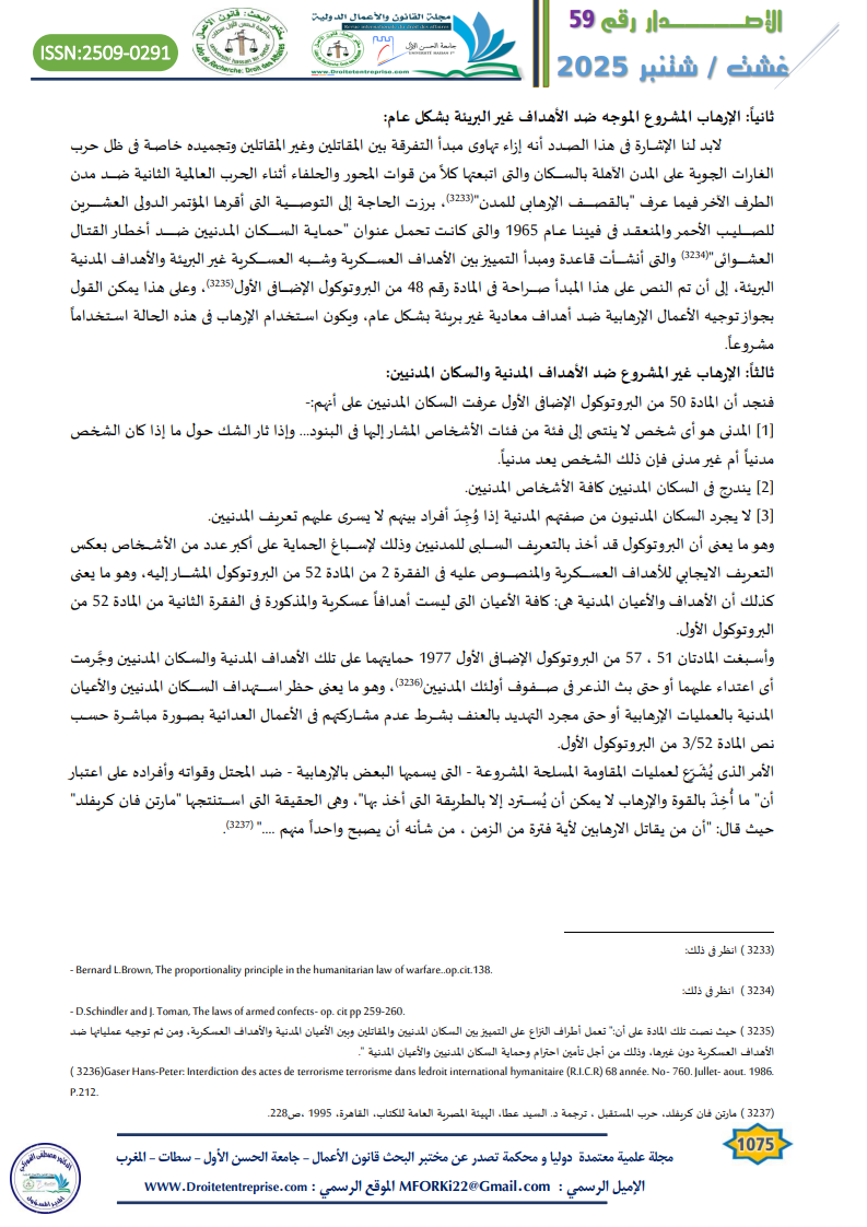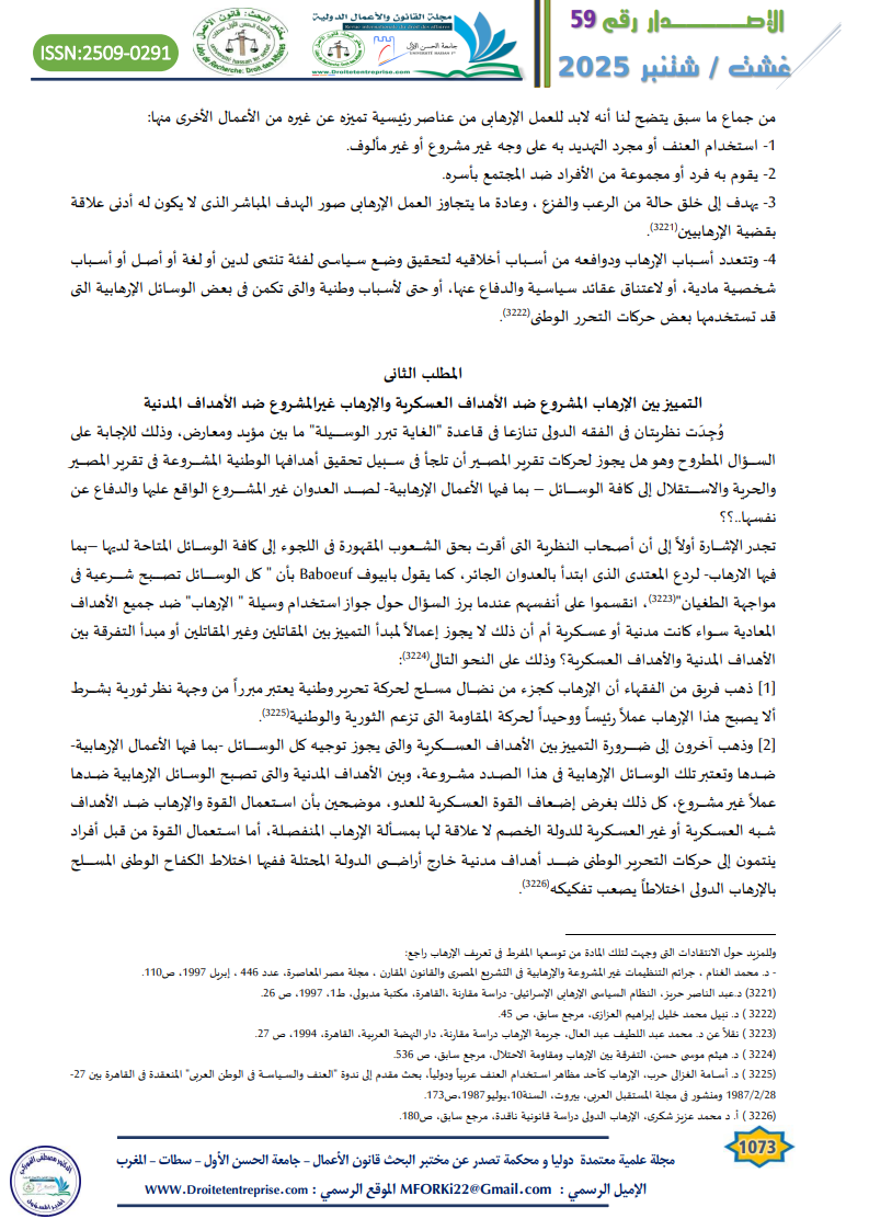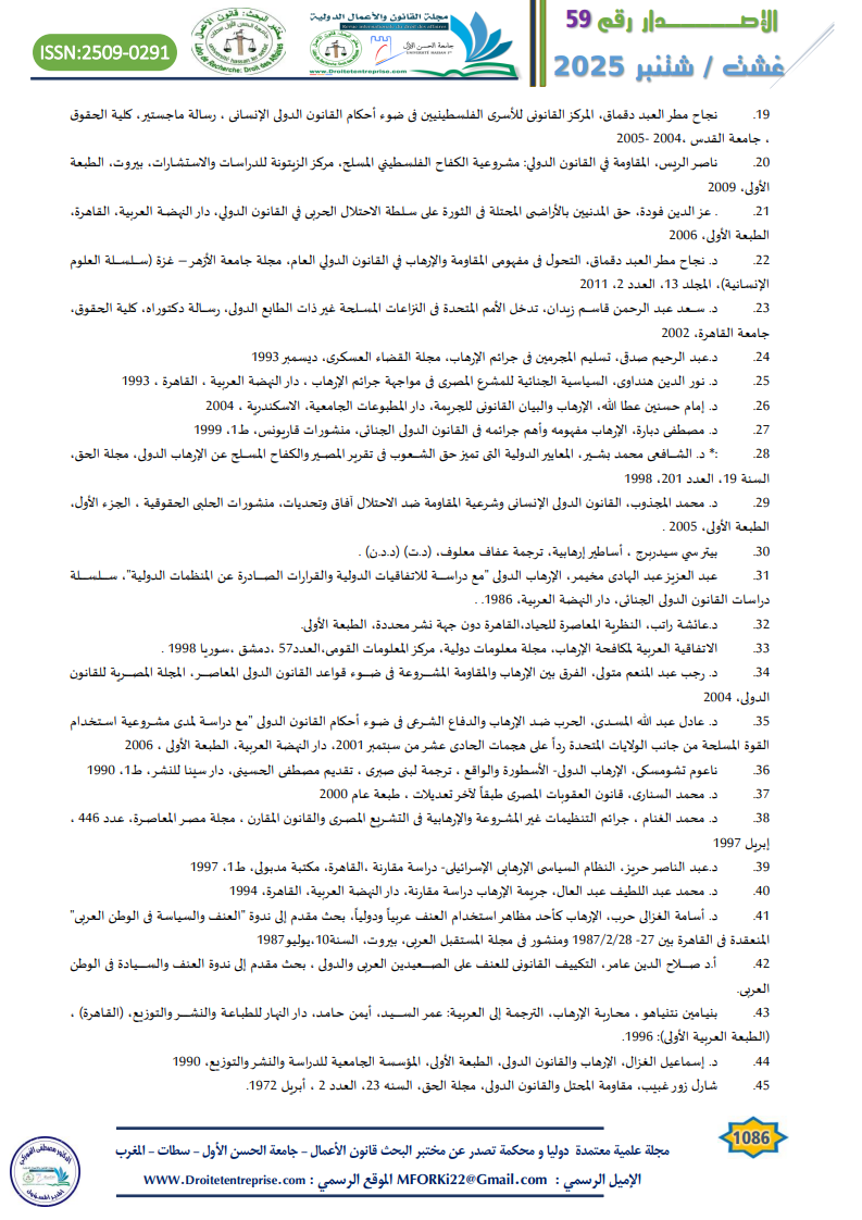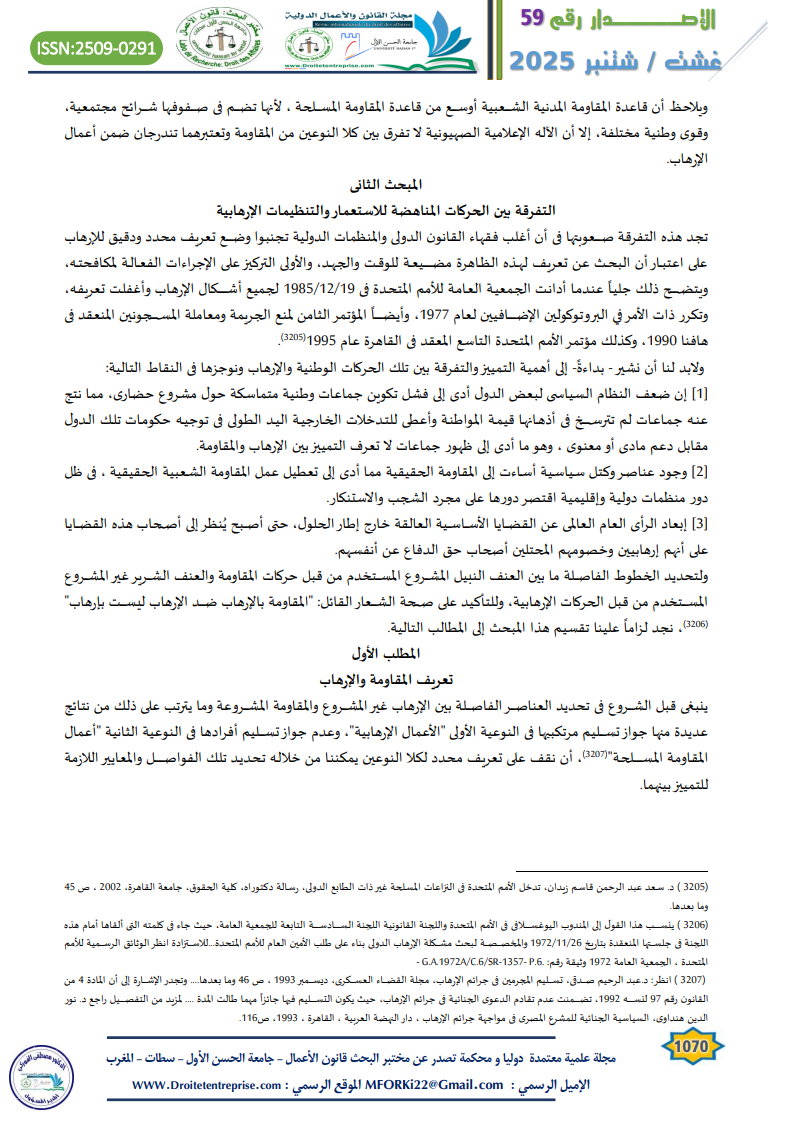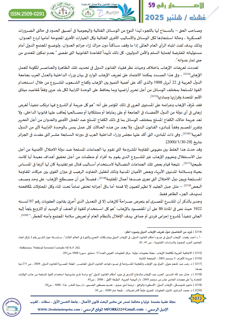 - ( ) د. رجب عبد المنعم متولى، الفرق بين الإرهاب والمقاومة المشروعة فى ضوء قواعد القانون الدولى المعاصر، المجلة المصرية للقانون الدولى، 2004 ، ص 271 وما بعدها. ↑