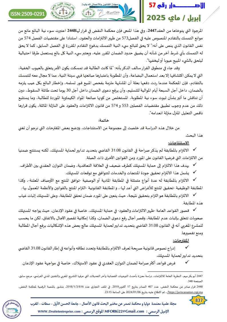 - استمرار الفقه والقضاء في التوسع في تفسير الالتزام بالمطابقة، لضمان حماية أكبر للمستهلكين وتعزيز تطبيق القانون بشكل أكثر عدالة.