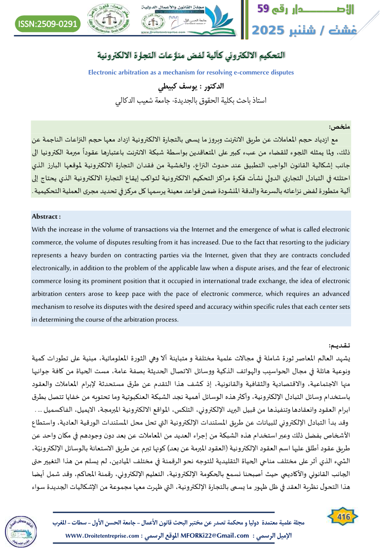 التحكيم الالكتروني كآلية لفض منازعات التجارة الالكترونية الدكتور : يوسف كبيطي