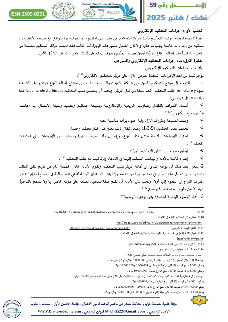 With the increase in the volume of transactions via the Internet and the emergence of what is called electronic commerce, the volume of disputes resulting from it has increased. Due to the fact that resorting to the judiciary represents a heavy burden on contracting parties via the Internet, given that they are contracts concluded electronically, in addition to the problem of the applicable law when a dispute arises, and the fear of electronic commerce losing its prominent position that it occupied in international trade exchange, the idea of electronic arbitration centers arose to keep pace with the pace of electronic commerce, which requires an advanced mechanism to resolve its disputes with the desired speed and accuracy within specific rules that each center sets in determining the course of the arbitration process.
