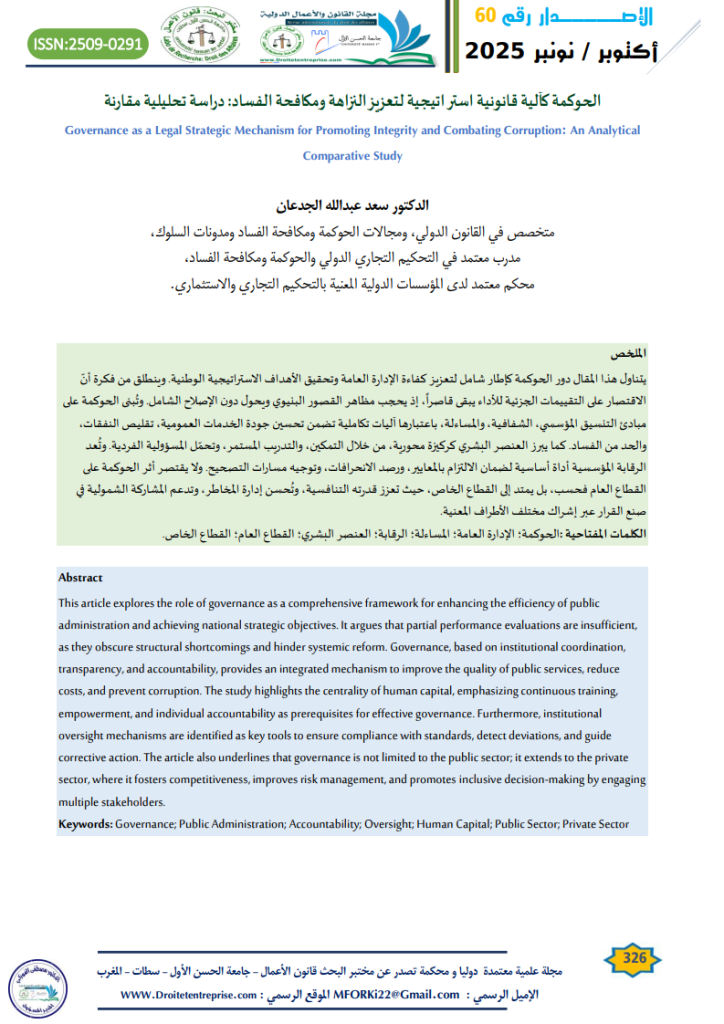 الحوكمة كآلية قانونية استراتيجية لتعزيز النزاهة ومكافحة الفساد: دراسة تحليلية مقارنة – الدكتور سعد عبدالله الجدعان