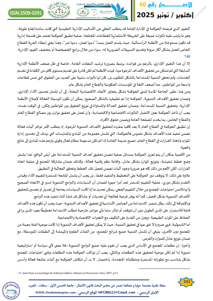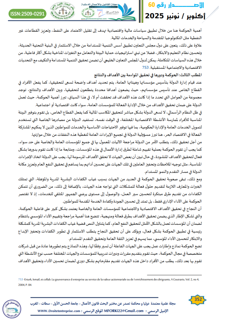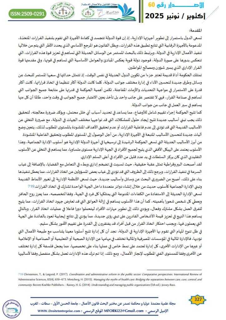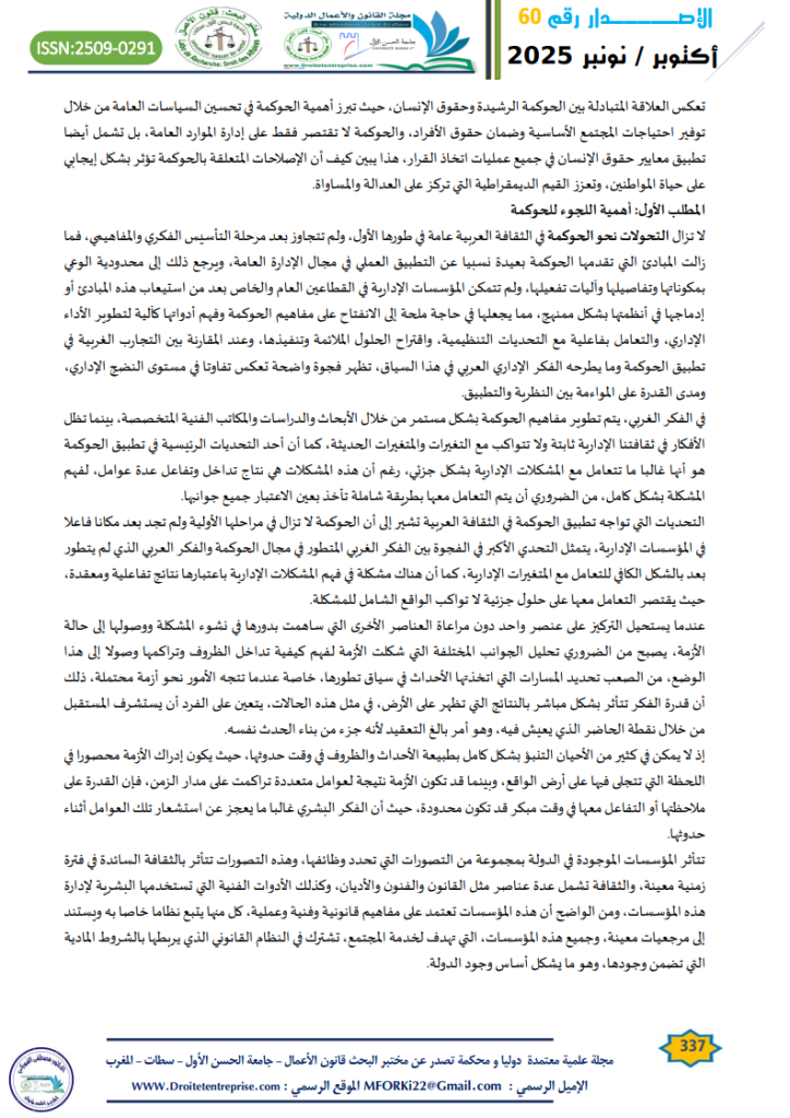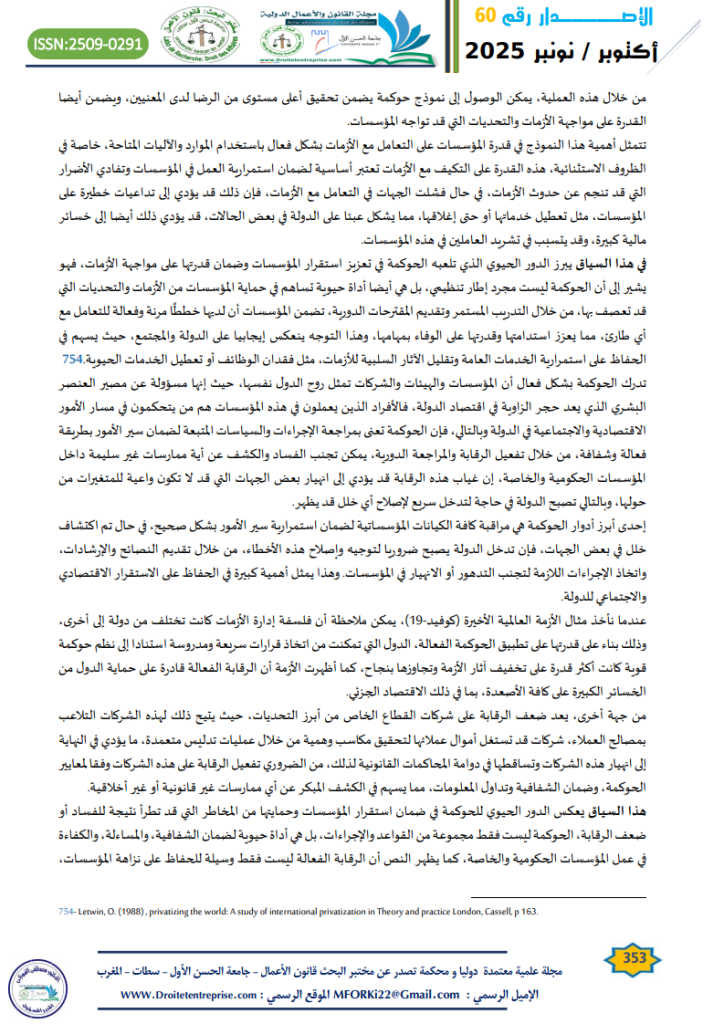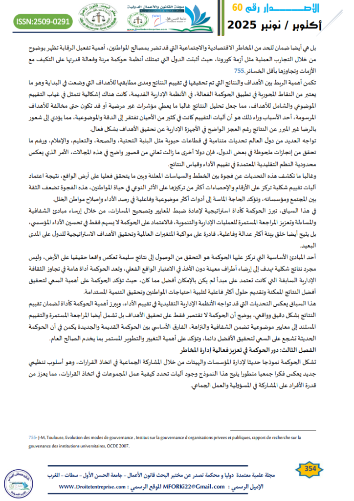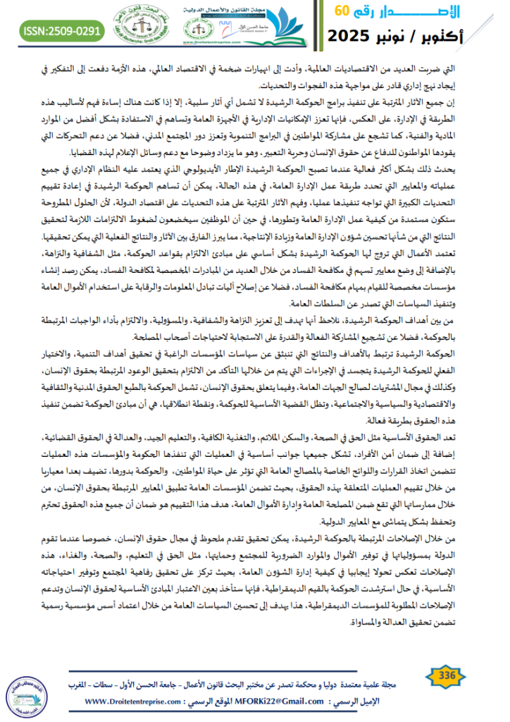 يتناول هذا المقال دور الحوكمة كإطار شامل لتعزيز كفاءة الإدارة العامة وتحقيق الأهداف الاستراتيجية الوطنية. وينطلق من فكرة أنّ الاقتصار على التقييمات الجزئية للأداء يبقى قاصراً، إذ يحجب مظاهر القصور البنيوي ويحول دون الإصلاح الشامل. وتُبنى الحوكمة على مبادئ التنسيق المؤسسي، الشفافية، والمساءلة، باعتبارها آليات تكاملية تضمن تحسين جودة الخدمات العمومية، تقليص النفقات، والحد من الفساد. كما يبرز العنصر البشري كركيزة محورية، من خلال التمكين، والتدريب المستمر، وتحمّل المسؤولية الفردية. وتُعد الرقابة المؤسسية أداة أساسية لضمان الالتزام بالمعايير، ورصد الانحرافات، وتوجيه مسارات التصحيح. ولا يقتصر أثر الحوكمة على القطاع العام فحسب، بل يمتد إلى القطاع الخاص، حيث تعزز قدرته التنافسية، وتُحسن إدارة المخاطر، وتدعم المشاركة الشمولية في صنع القرار عبر إشراك مختلف الأطراف المعنية.