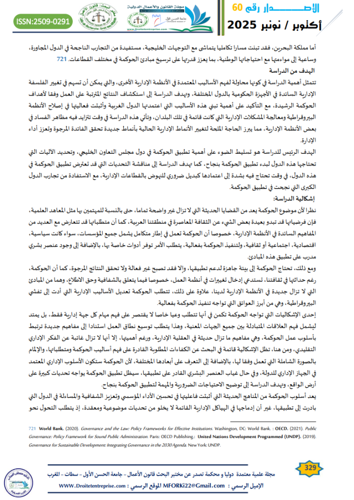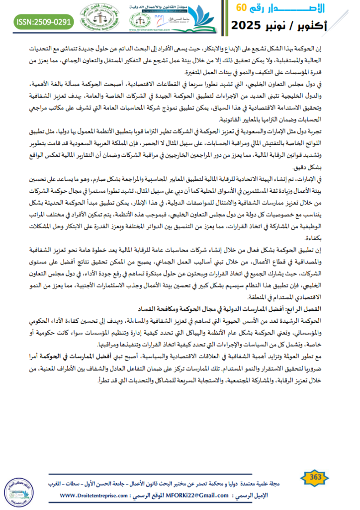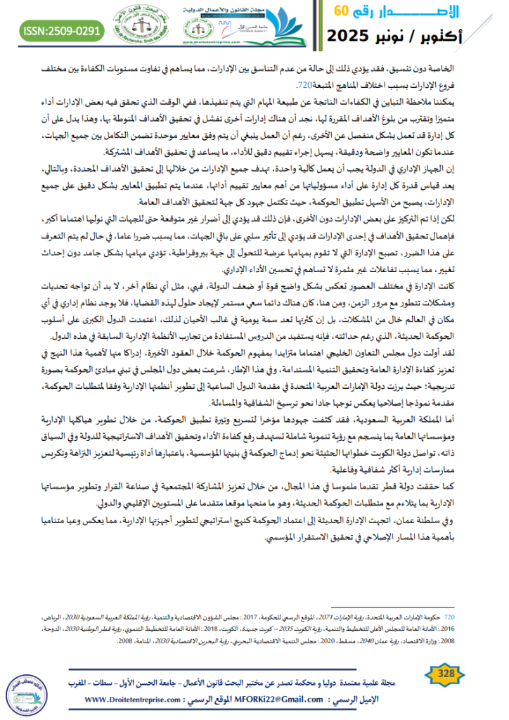 أما المملكة العربية السعودية، فقد كثفت جهودها مؤخرا لتسريع وتيرة تطبيق الحوكمة، من خلال تطوير هياكلها الإدارية ومؤسساتها العامة بما ينسجم مع رؤية تنموية شاملة تستهدف رفع كفاءة الأداء وتحقيق الأهداف الاستراتيجية للدولة وفي السياق ذاته، تواصل دولة الكويت خطواتها الحثيثة نحو إدماج الحوكمة في بنيتها المؤسسية، باعتبارها أداة رئيسية لتعزيز النزاهة وتكريس ممارسات إدارية أكثر شفافية وفاعلية.