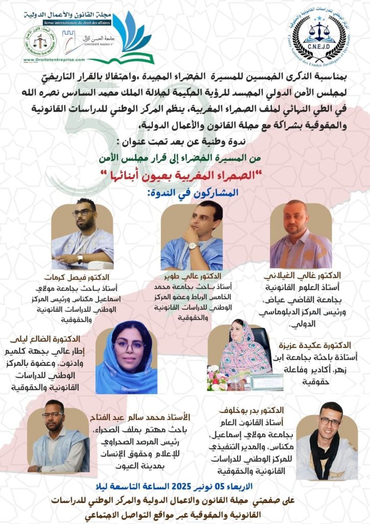 شهدت الساحة القانونية والأكاديمية بالمغرب ليلة أمس الاريعاء 05 نونبر 2025 حدثًا وطنيًا بارزًا، إذ نظّم المركز الوطني للدراسات القانونية والحقوقية بشراكة مع مجلة القانون والأعمال الدولية ندوة وطنية افتراضية موسعة بعنوان “من المسيرة الخضراء إلى قرار مجلس الأمن: الصحراء المغربية بعيون أبنائها”.