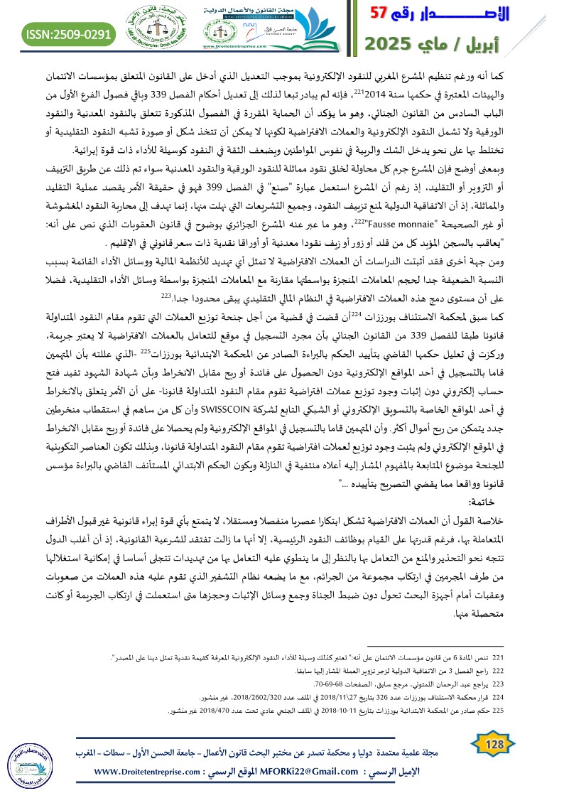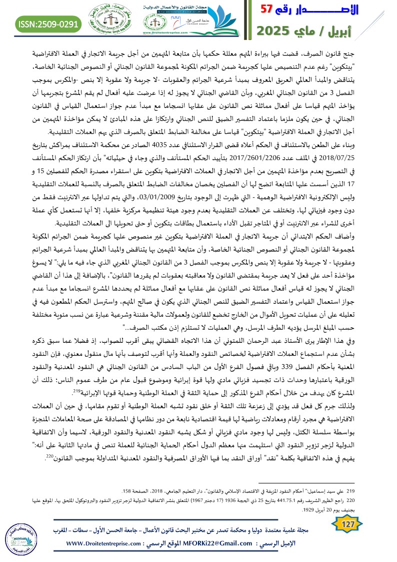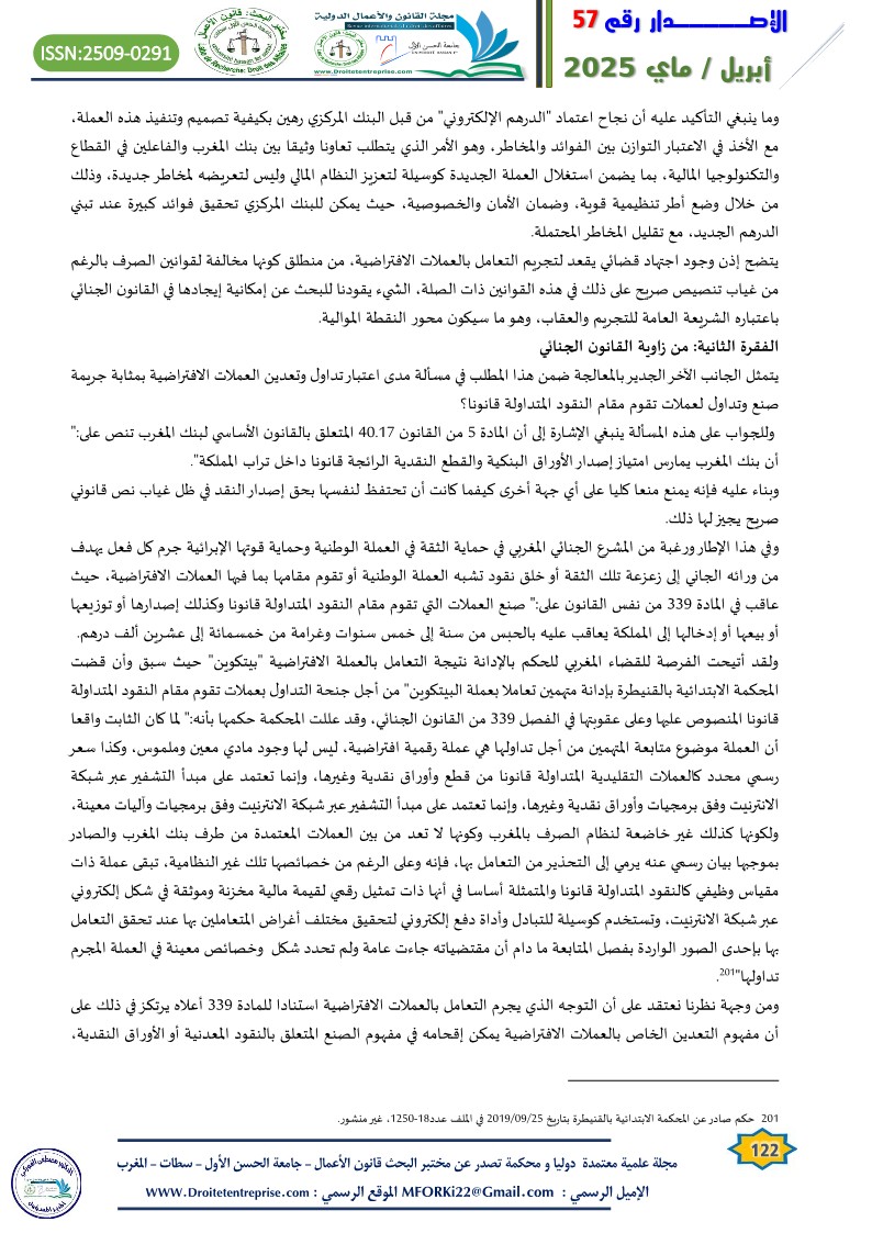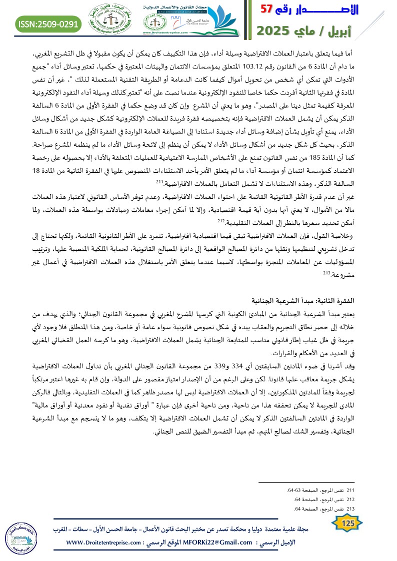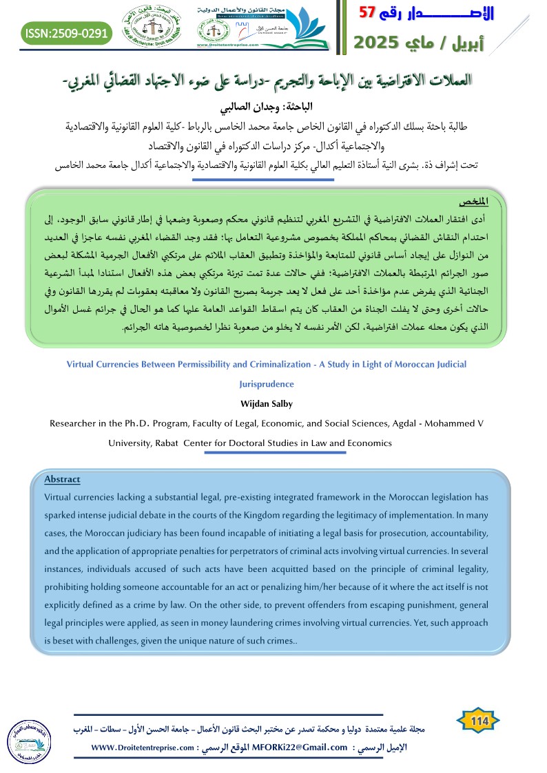 Virtual currencies lacking a substantial legal, pre-existing integrated framework in the Moroccan legislation has sparked intense judicial debate in the courts of the Kingdom regarding the legitimacy of implementation. In many cases, the Moroccan judiciary has been found incapable of initiating a legal basis for prosecution, accountability, and the application of appropriate penalties for perpetrators of criminal acts involving virtual currencies. In several instances, individuals accused of such acts have been acquitted based on the principle of criminal legality, prohibiting holding someone accountable for an act or penalizing him/her because of it where the act itself is not explicitly defined as a crime by law. On the other side, to prevent offenders from escaping punishment, general legal principles were applied, as seen in money laundering crimes involving virtual currencies. Yet, such approach is beset with challenges, given the unique nature of such crimes..