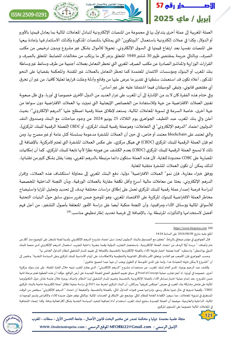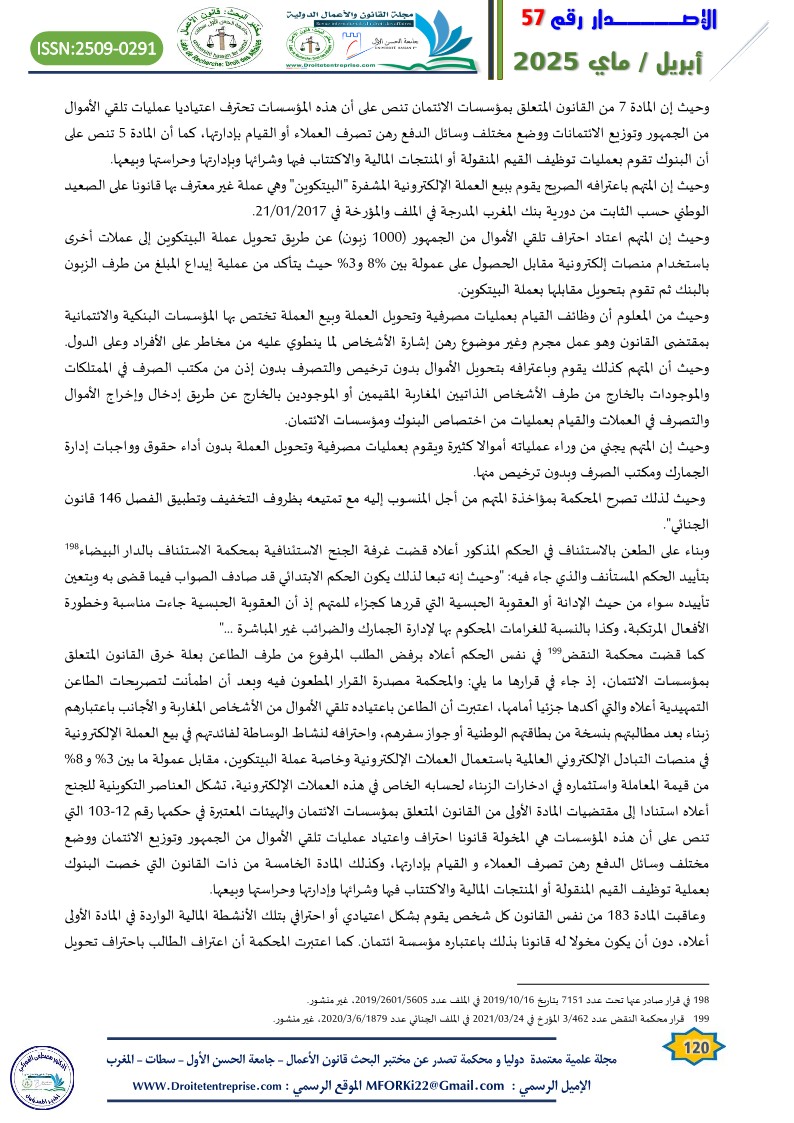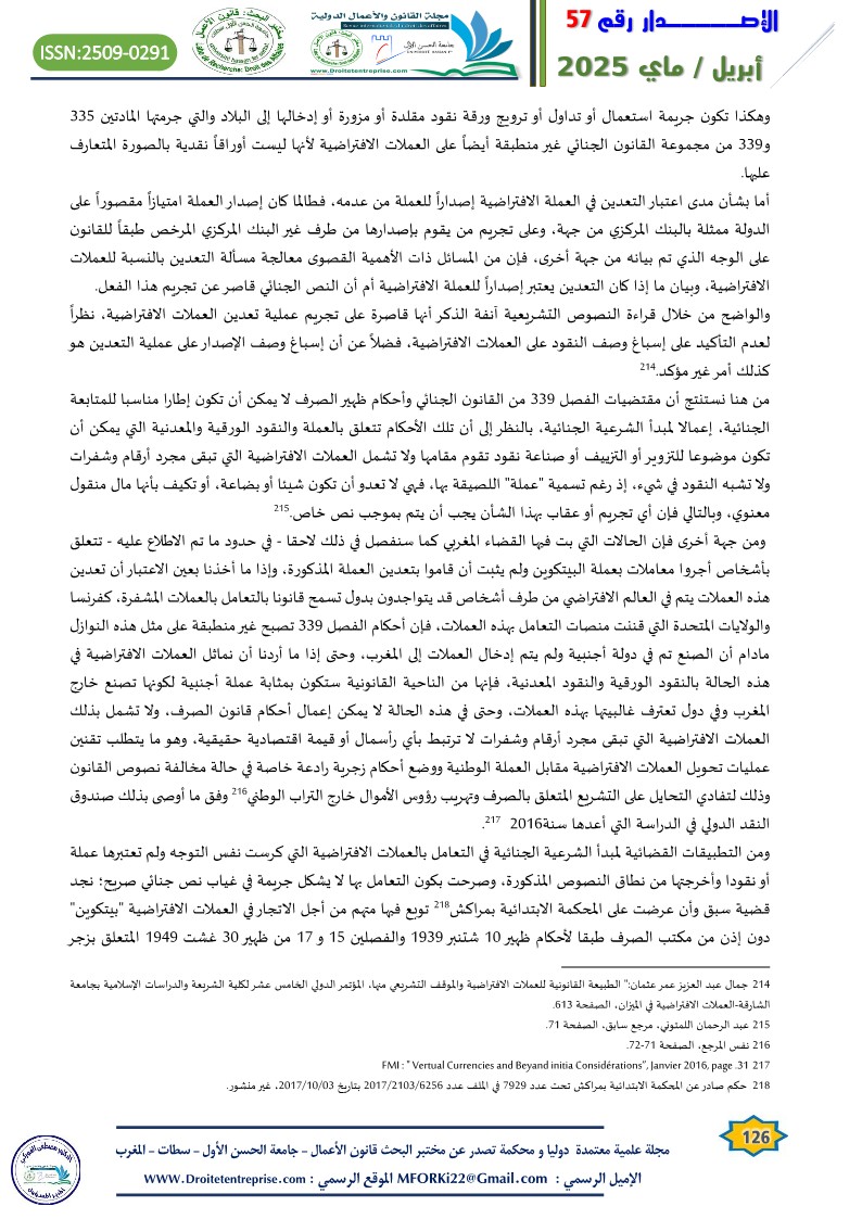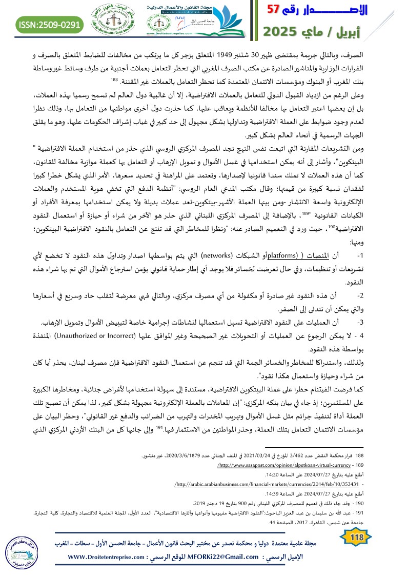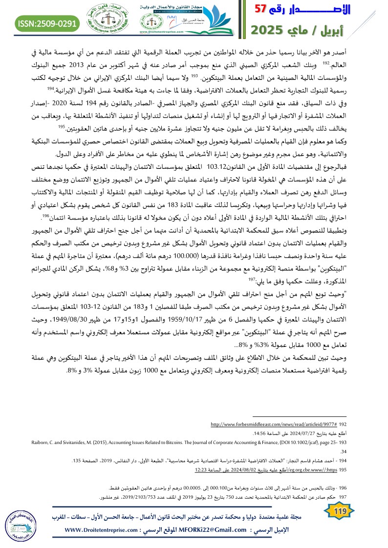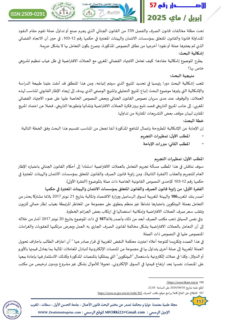 Virtual currencies lacking a substantial legal, pre-existing integrated framework in the Moroccan legislation has sparked intense judicial debate in the courts of the Kingdom regarding the legitimacy of implementation. In many cases, the Moroccan judiciary has been found incapable of initiating a legal basis for prosecution, accountability, and the application of appropriate penalties for perpetrators of criminal acts involving virtual currencies. In several instances, individuals accused of such acts have been acquitted based on the principle of criminal legality, prohibiting holding someone accountable for an act or penalizing him/her because of it where the act itself is not explicitly defined as a crime by law. On the other side, to prevent offenders from escaping punishment, general legal principles were applied, as seen in money laundering crimes involving virtual currencies. Yet, such approach is beset with challenges, given the unique nature of such crimes..