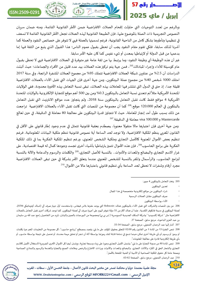 وخلاصة القول، فإن العملات الافتراضية تبقى قيما اقتصادية افتراضية، تتمرد على الأطر القانونية القائمة، ولكنها تحتاج إلى تدخل تشريعي لتنظيمها ونقلها من دائرة المصالح الواقعية إلى دائرة المصالح القانونية، لحماية الملكية المنصبة عليها، وترتيب المسؤوليات عن المعاملات المنجزة بواسطتها، لاسيما عندما يتعلق الأمر باستغلال هذه العملات الافتراضية في أعمال غير مشروعة.