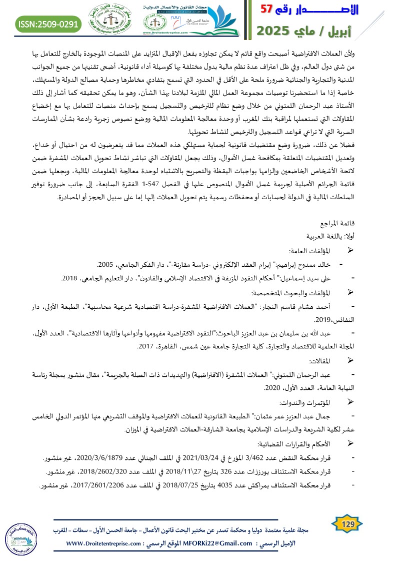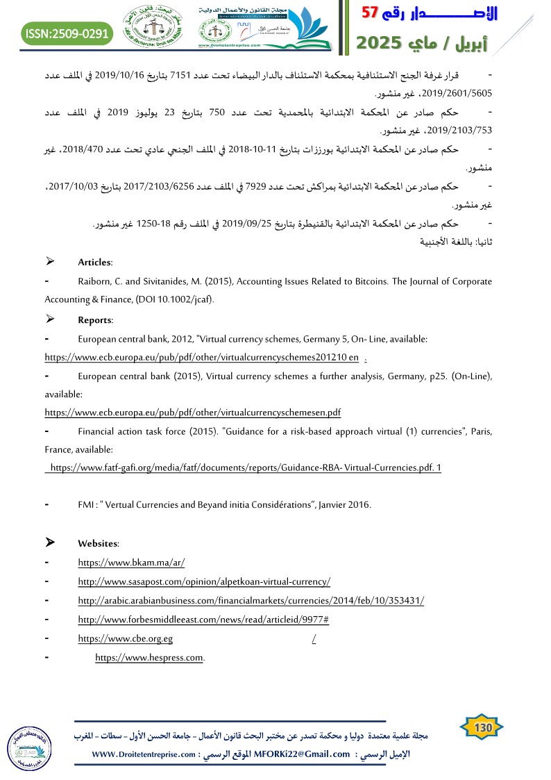 – عبد الرحمان اللمتوني:” العملات المشفرة (الافتراضية) والتهديدات ذات الصلة بالجريمة”، مقال منشور بمجلة رئاسة النيابة العامة، العدد الأول، 2020.