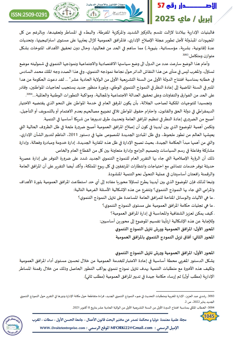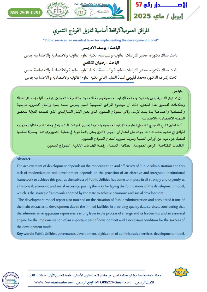 الكلمات المفتاحية: المرافق العمومية، الحكامة، التنمية، رقمنة الخدمات الإدارية، النموذج التنموي.