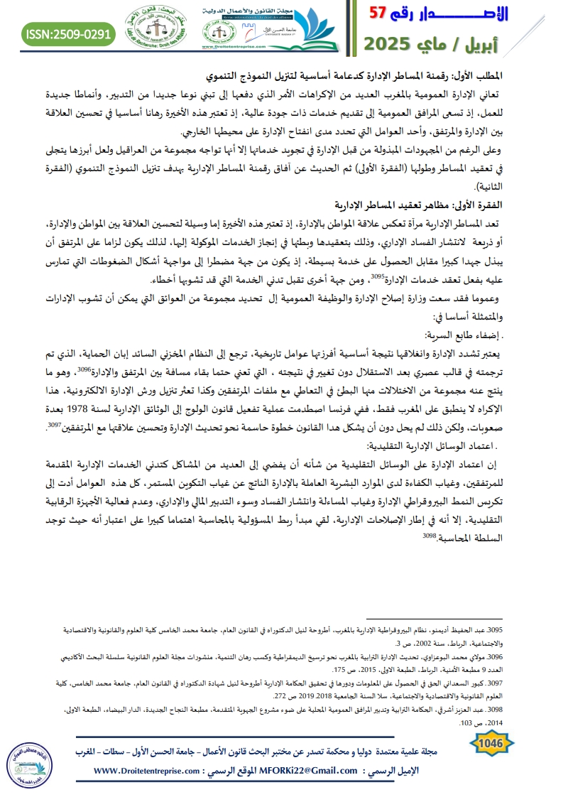 [6] ـ رشدي عبد العزيز، الإدارة المغربية ومتطلبات التحديث في ضوء النموذج التنموي الجديد، قراءة متقاطعة حول مكانة الإدارة ودورها في التقرير حول النموذج التنموي الجديد يناير 2022، ص 2.